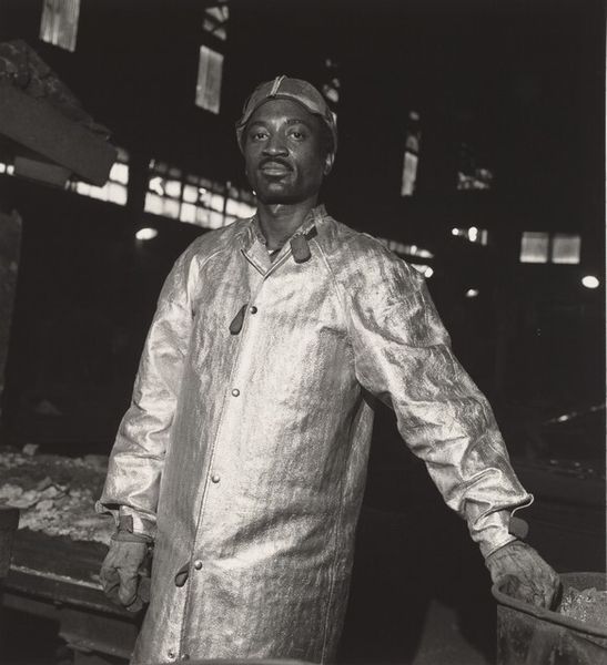 Curator: Milton Rogovin captured this image, titled "Untitled (Lower West Side series)," in 1985. It's a gelatin silver print, a poignant example of his social-realist approach. Editor: It's funny, my first thought wasn't about social commentary, but about texture. Look at the tweed of his jacket versus the brick wall and the almost ghostly graffiti. There's something beautiful, though a little melancholy. Curator: Rogovin's work consistently turned its gaze to the marginalized. His Lower West Side series, in particular, documented communities often overlooked, exploring themes of poverty, resilience, and social inequality in the face of deindustrialization. We should read his portrait as a political statement about the city. Editor: Absolutely. And even with that heavier context, I'm still struck by the individual. His posture is so composed. Look at the cane—it’s functional, sure, but the way he holds it gives him a sense of dignity, almost regal. I wonder about his story. I want to know what kind of dreams that man harbors behind his somber gaze. Curator: Right. Placing Rogovin within a larger discussion about photographic representation becomes critical here. The series emerged at a time when discussions around identity and representation were gaining traction in the art world and society. We see Rogovin challenging mainstream media’s one-dimensional representations of those neighborhoods, emphasizing instead his subject’s complex humanity. Editor: It's a beautiful balance he strikes. This isn't exploitation; it feels like respectful observation. I mean, I am thinking now: What does it mean to present him as the hero of his own story, given the very visible economic hardship? Curator: Well, that is why Rogovin's images are more relevant than ever, encouraging dialogues about class, urban decay, and what constitutes ethical representation within visual culture. This photograph is more than just a portrait; it’s a document of a specific historical moment and also prompts much larger questions about who gets seen and how they are remembered. Editor: Exactly. Now that I am taking another look, I feel that Rogovin is forcing me to remember. To remember lives I would rather not confront. Now it's hard to ignore.