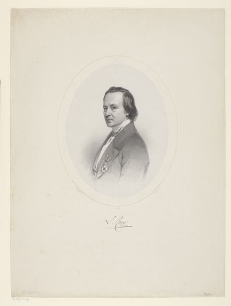 Willem Philip van der Veken created this portrait of an unknown man using etching. The composition centers on the man's face, framed within a soft, circular vignette against a stark, rectangular background. The limited tonal range emphasizes form and texture, inviting a detailed observation of line and shadow. The arrangement of shapes creates a dynamic tension. The vignette, seemingly detached, floats within the broader frame, which challenges our conventional understanding of pictorial space. This interplay destabilizes the portrait format, suggesting a concern with representation. The etching technique produces a linear quality, reminiscent of early photographic processes, which further complicates the relationship between subject, artist, and viewer. Notice how the artist's signature merges with the sitter's name and forms an integral structural component of the image. In this way, the image pushes the boundaries of portraiture beyond mere likeness, functioning as a reflection on identity and artistic creation.