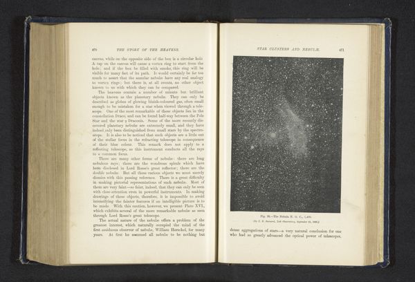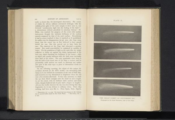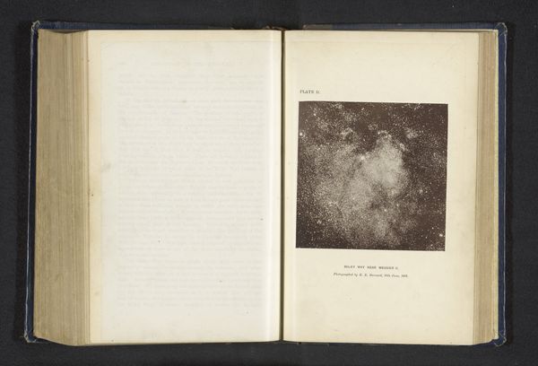 Curator: Here we see a page from a book that contains a print of E. Demole's photograph "Zonsverduistering op 16 mei 1900", predating 1900. The photograph captures a solar eclipse. What is your initial reaction? Editor: It feels spectral, almost eerie. That faint crescent of light surrounded by so much swirling darkness… there's an undeniably dramatic quality to it. Curator: Absolutely. It’s a reminder that this image comes from a period of heightened interest in astronomical phenomena, fueled by both scientific advancement and perhaps a lingering sense of mystery about the cosmos. Photography played a crucial role in documenting these events, making them accessible to a wider public. How do you think this access reshaped cultural understanding? Editor: Well, images like this helped demystify astronomical events while simultaneously sparking the public imagination. You know, it becomes less an omen and more an event to be documented and discussed. Curator: Precisely. And consider Demole's likely audience: the late 19th-century public, hungry for knowledge but still navigating the transition from a world steeped in myth to one grounded in scientific explanation. A print like this allowed for shared experiences of cosmic wonders, but only for those with resources. How can we discuss access to this kind of media, the intersectional privilege required to see a book with photographic prints? Editor: It speaks volumes about who controlled not just the narrative but also the tangible experience of scientific discovery. So much science has built on existing, accessible privilege that allowed some to observe with the most advanced equipment, and now photograph astronomical phenomena and further build capital for their research by creating expensive keepsakes. This image is interesting also when reflecting on power structures within both scientific fields and the arts, too. Curator: I agree. It pushes us to reconsider the cultural authority embedded in seemingly objective scientific imagery, especially given who gets to both observe and interpret these images. The composition and light evoke feelings of fragility and awe. It becomes a reminder of our relative insignificance in the face of the cosmos, as much as a celebration of scientific understanding. Editor: Exactly. Looking at this piece now is to remember this eclipse in a wider story about power and privilege.