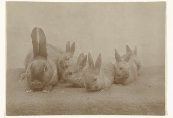 Curator: These sleepy, stoic rabbits captured by Richard Tepe between 1900 and 1930. A quiet, sepia-toned photograph housed here at the Rijksmuseum. What's your immediate take? Editor: Intimacy. There’s a quiet gentleness radiating from these two rabbits; their stillness and closeness invite a moment of reflection, like a shared secret, a comforting, wordless bond. They huddle on what seems like fresh earth. Curator: Yes, I get that entirely, it makes me think of childhood pets, really… a moment of peace perhaps before something inevitably went wrong in their world, you know, the cage door opened and a cat strolled past. Anyway, I feel Tepe has this knack of really zoning in on animal character, making them both noble and ordinary, as in, they are just rabbits! Editor: Exactly! That liminal space, that 'both/and' opens up crucial insights. Rabbits, historically, exist as figures of exploitation and commodification and exist as potent cultural symbols of fertility, the spring goddess Eostre and associated with subversive female desire. So who owns whom here, and to what end? Curator: Oh, that’s quite a reading. To be fair I didn’t see that at all… although now you mention it, the very earth they lie on – which struck me as ‘natural’, freshly turned – also represents a confined space for burrowing… a barrier maybe? A reminder that ‘freedom’ for these two will only ever be experienced on these limited terms. It's very… layered! Editor: It is layered! Consider too, who the photographic image addresses – a patriarchal scientific gaze focused on documenting the natural world; a turn-of-the-century colonial logic predicated on mapping bodies and resources. Whose order, finally, are we observing? Curator: Gosh… now I feel almost guilty for seeing only the softness. Perhaps the stark simplicity serves to heighten our awareness of control; even tenderness carries shadows, and Tepe manages to hint at those in such subtle ways. Editor: And perhaps this work challenges our romanticizing view of nature by highlighting the politics inherent in observation and representation, encouraging us to think critically about our place within it all.