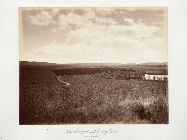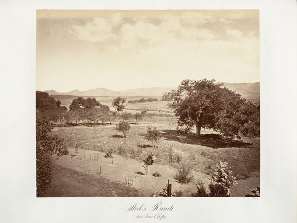 Editor: Here we have Carleton Watkins' "Santa Margarita Ranch," an albumen print from 1876. It depicts exactly that: a ranch, complete with a lone tree and distant mountains. I find the open field quite striking, almost mournful. What do you see in this piece? Curator: The most striking thing about the open field is how empty it feels. An iconographer would call that negative space, ripe with meaning. It asks, "What *isn't* here?" And what isn't here are the original inhabitants, displaced from that land. The tree, often a symbol of rootedness and life, could even stand as a solitary witness to that history. Editor: So the open field, which I interpreted as empty, you read as being pregnant with meaning about loss and displacement. Interesting. Curator: Precisely. Consider, too, that this photograph was made during a period of rapid westward expansion in America. Images like this were not neutral documents, but helped create a visual language of conquest and settlement. Editor: Like a symbolic reshaping of cultural memory to reflect a specific, perhaps biased, narrative? Curator: Yes. Watkins' technical skill is undeniable. Yet the power of photography lies not just in what it shows, but in what it omits or emphasizes. The light itself almost seems to illuminate a particular idea. Editor: This definitely gives me a new perspective on landscape photography. Thanks! Curator: And thank you for asking insightful questions! It's a reminder that images are never truly silent.