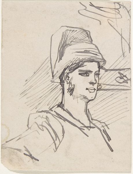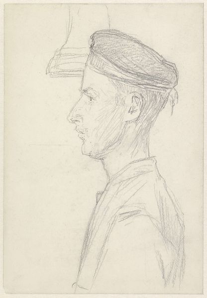 Curator: This graphite and pencil drawing from the Städel Museum collection is entitled "Leutnant Polzderf, Brustbild mit Tschako nach rechts," and the artist is Carl Hoff. Editor: My initial impression is one of sketched immediacy – there's a lightness to the touch, but a firm rendering of structure. It evokes a somewhat theatrical and militaristic air. Curator: The handling of line is superb. Look how the artist delineates form and volume with simple hatching, lending considerable depth to the lieutenant’s features and elaborate military cap. Notice how little tone there actually is, yet the implied volumes are palpable. Editor: Indeed. It's fascinating how seemingly innocuous these portraits can be at face value, yet potentially laden with the burden of the historical realities of militarism and social hierarchies. Is there a specific context informing Hoff's portrayal here? Was he critical of the military, perhaps? Curator: Hoff was, more accurately, a history painter. This may be preparatory work toward a larger history painting or study piece showing types. The artist is likely studying a historical type to incorporate as extras in some elaborate canvas that requires numerous figures. Editor: Which raises further questions about the objectification, dehumanization and commodification of those figures. There is something unsettling to me about this portrait – the vacant stare, the formulaic moustache. It presents the banality of state-sponsored power and violence, if one knows their history. Curator: Your reading of the piece is interesting, albeit through the lens of modern sensitivities. I see the composition in terms of line, tonal gradation and the overall formal qualities, its visual rhythm creating an overall cohesive image. The balance between realism and perhaps a touch of caricature is masterful, revealing a skilled and assured draughtsman. Editor: Well, looking at art means also understanding social impact and meaning. These issues aren't necessarily anachronistic, as the representation of power dynamics is ongoing. Even through Hoff's formalistic intentions, his work still sparks contemplation on wider narratives that echo into the present. Curator: That’s quite possible. Still, I’m more captivated by how the image functions in pure compositional terms and the relationship between the volumes described. Editor: As for me, the political interpretation seems richer for its day as well. It encourages reflection.