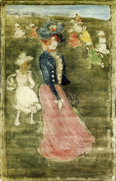 Curator: Immediately striking is the dramatic stillness of this watercolor by Edmund Dulac. A regal woman stands beside a black panther against an aged-looking, apricot backdrop. There is a certain air of magic here, don’t you think? Editor: Yes, there's an enchanting allure! The composition, though simple, is quite powerful. The darkness of the panther and the queen's garb set against that textured ground create such an imposing silhouette, particularly given the delicate medium. It suggests both danger and nobility. Curator: Indeed. This piece is titled “The Arabian Nights: The Queen of the Ebony Isles,” and was probably purposed as a book illustration, though there's not any record of precisely when Dulac executed it. Dulac's illustrations were highly sought after. What draws my eye is how Dulac adopts an orientalist style. The rendering and detail are almost like manuscript illuminations. Editor: Absolutely, and if you consider the panther itself, the cultural memory attached to these creatures—panthers have long been associated with guardianship, feminine power, and the exotic. Their visual representation echoes in mythology and folklore, often linked to powerful goddesses. By pairing the Queen with such a creature, Dulac amplifies her own mystique, imbuing her with that sense of otherworldliness. Curator: What's also fascinating to me is how Dulac navigates the world of publishing and how such imagery would have played within societal perceptions of the East. How was this visual language used to shape public understanding? Who had access to these images? These questions underpin the social relevance of artworks like these, especially within colonial frameworks. Editor: True. By engaging with symbolism that transcends borders, we access deeper psychological dimensions that shape our ongoing collective understanding, like, how this depiction reinforces power dynamics or contributes to idealized views of the East, or conversely subverts our Western expectation, challenging what power or femininity may mean through a cultural perspective. Curator: I find the use of watercolors really heightens that tension, its fluidity almost suggestive of both fragility and freedom simultaneously, especially given the subject and theme. Editor: An evocative marriage of artistry and metaphor, prompting so many levels of contemplation across history and symbol. Curator: An illustration, perhaps timeless through these very tensions.
