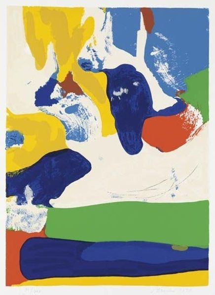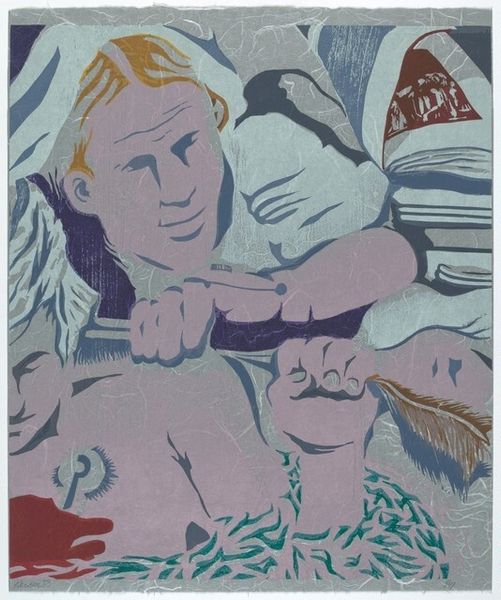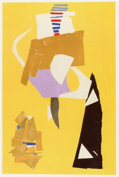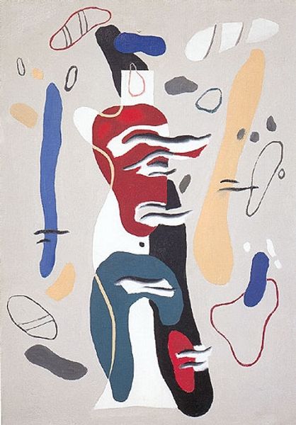 Curator: This vibrant print by Maurice Wyckaert, currently untitled, captivates with its abstract forms. It is held here at the Tate. Editor: Yes, immediately I am struck by the bold color palette. The juxtaposition of that intense red with the muted blues and greens creates a compelling visual tension. Curator: Considering Wyckaert's influences, one could interpret the red as a symbol of passion or even violence, clashing with the softer blues that might represent tranquility or introspection. Editor: Or perhaps the red simply functions as a focal point, drawing the eye across the composition. The layering of colors and shapes creates a dynamic interplay of positive and negative space. Curator: It is a dance between chaos and order. The imagery hints at organic forms, maybe even a landscape, filtered through a distinctly modern lens. Editor: Precisely. The interplay between these structured compositions and gestural mark-making really elevates the piece. I found the contrast very compelling. Curator: I agree. Wyckaert invites us to contemplate the complexities of human experience through a visual language that is both familiar and strange.
