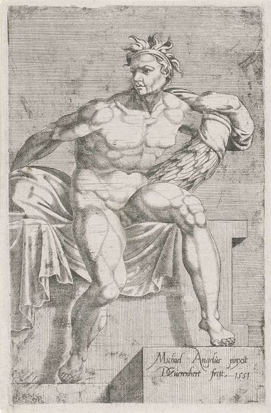 Editor: This is "Zittend naakt uit de Sixtijnse kapel" from 1551, an engraving by Dirck Volckertsz Coornhert, housed in the Rijksmuseum. The figure looks powerful, classical almost, but also seems confined somehow. I am interested in understanding it better. What do you make of it? Curator: Well, the materiality of this print offers a fascinating point of entry. Consider the labor involved in producing an engraving like this back then. The precision required to transfer Michelangelo's idealized form onto a copper plate, and then the multiplication of that image through printmaking. Editor: That’s a good point, it looks like hard work and technical know-how. But what does that have to do with the image itself? Curator: It's not separate! Think about the intended audience. These prints circulated widely, making the Sistine Chapel's art accessible to a broader public, consuming this idealized male form as a commodity. It changes the work’s function and thus, the very meaning of Michelangelo's original fresco. The artist, the engraver, and the viewer participate in this process, creating cultural values and reinforcing historical structures through consumption. Does that change how you see the "power" and "confinement" you mentioned? Editor: It does make me consider the accessibility aspect more. The ability to share the idealized form far and wide. Was it just about that though? Or did this method have implications for artistic practice more broadly? Curator: Absolutely, it influenced it profoundly! It separated labor across artistic creation. With reproductive prints such as this, artists became removed from singular creation, with an artist like Michelangelo making initial art and someone else producing this engraving. Editor: So, it shows that even in the 16th century art-making was being industrialized. Thanks, I am really considering this print in an entirely different way. Curator: Indeed! It highlights the impact of material processes and the circulation of images on art, which continues to echo today.