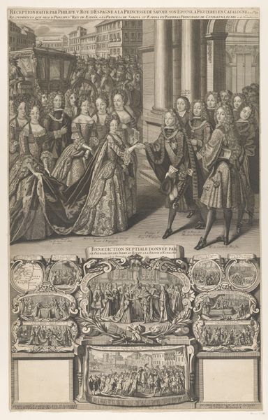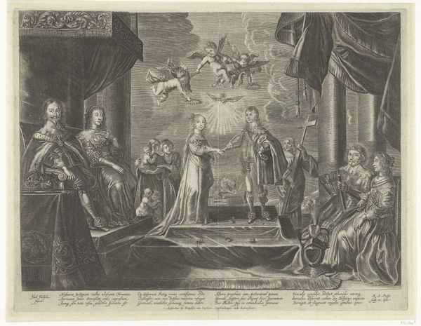 Editor: Here we have a rather detailed engraving, "Marriage of Prince William II and Mary Stuart, 1641", from, well, an anonymous artist. It depicts what looks like a very formal ceremony. I find the almost staged quality of the composition so fascinating; what strikes you first about it? Curator: Oh, it's pure theatre, isn’t it? Almost comically posed. The symbolic weight crushes any sense of naturalism. Did you notice how the royal figures flank the wedding like stony sentinels? It's less about witnessing love and more about securing alliances, right? I am wondering... what does the text mean? Editor: You're right, it does feel incredibly strategic. I haven't even tried to read the poems yet! Ah, it appears the text makes comparisons to England, and…burning oranges? What a strange visual! It praises this new union as a victory. It's odd to see those political undercurrents bubbling in what should be a joyous celebration, no? Curator: Exactly! This isn't just about love; it's geopolitical chess played on a matrimonial board. The hovering angels feel less heavenly, and more like propaganda. The style - baroque? With its drama and overt display, perfectly reflects that tension, don't you think? Also, it almost seems like some of the subjects are about to begin dancing and others like they are sitting at a courtroom gallery. Editor: Now that you point it out, I see how even the cherubs feel... staged. Baroque propaganda, I love that. I initially viewed it as a simple historical record, but it is now something completely different. Thanks! Curator: Isn't it marvelous how a second look can flip our perspective? And remember, even 'simple' historical records carry hidden agendas and silent witnesses. There's always a story beneath the surface if you're willing to dig.