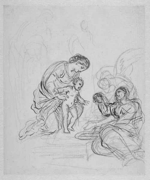 Francesco La Marra made this drawing, "Two studies of a woman with a child and one of the head of a woman" with pencil. We know that La Marra lived and worked in Naples, Italy during the height of the Neapolitan School. Here, we see the artist working out compositions and motifs related to motherhood. It's clear that La Marra is interested in the relationships between mother and child, how the figures support and embrace each other. The drawing is reminiscent of the visual codes used in religious paintings of the Madonna and Child that were very popular in Naples at the time. Yet this is not, as far as we know, a preparatory drawing for a religious painting. Instead, it seems that La Marra is interested in using established artistic traditions to explore real-world relationships and themes. As art historians, we can look to sources such as letters, journals, and other documents to learn more about the social context in which La Marra created this moving drawing.