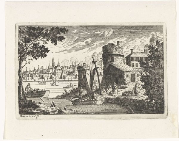 Editor: Here we have Jan Vincentsz. van der Vinne's "Italiaanse haven" from 1686, it looks like an ink sketch on aged paper. The composition feels both precise and kind of dreamy, almost as if recalling a memory. It's incredibly detailed for a sketch. What strikes you when you look at this? Curator: It’s like finding a little window into someone's imagination, isn't it? I'm particularly drawn to the way Van der Vinne captures the light. Notice how the light almost seems to dance across the architecture. It gives the whole scene a rather whimsical quality, even a romantic air despite the everyday subject. Do you feel the romance in the harbor light? Editor: I see what you mean, now that you mention it. There's something undeniably lovely about how the light hits that central building. So, is the scene meant to portray a particular harbor? Curator: Perhaps. Or maybe it’s an amalgam of several harbours, shaped by his memory and transformed through his emotional filter. It could also be pure fantasy, spun from the stories and images that populated the Dutch Golden Age imagination! Editor: It is pretty evocative; it makes you want to imagine yourself right there. Curator: Exactly! Art can give you a very visceral sense of *being* somewhere you may have never actually *been.* Now tell me, did this conversation change your initial thoughts about the artwork? Editor: Yes, totally! It is far more complex than what it seemed at first glance. Thank you!