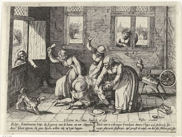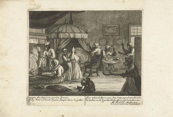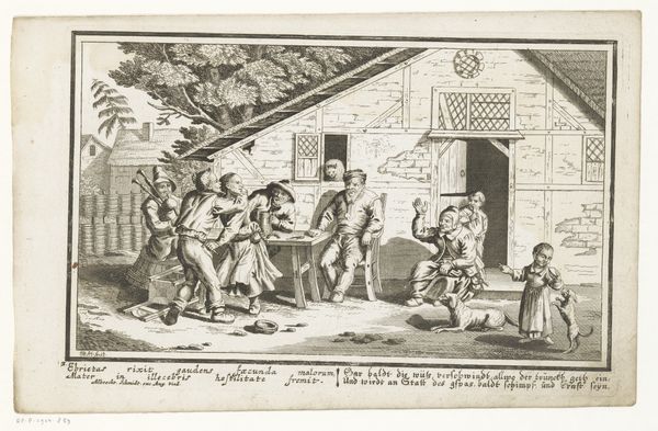 Editor: So, this is Elias Baeck's "Interior of a Farmhouse," an etching from somewhere between 1694 and 1744, placing it in the Dutch Golden Age. It has this really interesting staged feeling. Like we’re peeking in on a play. What do you see when you look at this piece? Curator: A play indeed! Perhaps a comedy… or maybe a morality tale in disguise? That doorway practically begs for interpretation. Look how the outside world – bare trees, wide-open fields – butts up against the intimate, cluttered interior. What do you think that division represents? Is it freedom versus comfort, responsibility versus escape? It all unfolds within a web of finely etched lines, like a story being whispered in monochrome. Editor: That tension between inside and outside hadn’t struck me so strongly before. The man pointing, is he sending the other one out, maybe chasing him away? Curator: Possibly! Or maybe guiding him towards a better life? That little window with the oddly-shaped bottle almost looks like an alchemist’s study. Notice how it frames that ordinary object like something precious, hinting perhaps that even the simplest life contains some element of mystery or transformation? I also keep getting drawn back to the group on the left; they appear contemplative but somewhat captive by that dark corner and that strange looking animal figure hiding above. What does their dynamic suggest to you? Editor: Maybe a cautionary one. Contentment versus aspiration. The careful details pull you in. Curator: The best genre scenes are little worlds onto themselves, full of secrets just waiting to be discovered. Now, I’m seeing those chickens – and they’re almost certainly a comment on this family and their drama! It’s not *just* pretty!