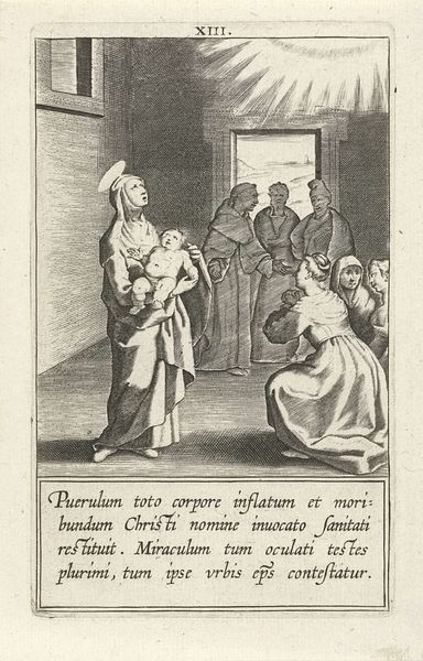 Curator: Here we have a 17th-century engraving by Boëtius Adamsz. Bolswert, titled "Vrouw vindt de ongeschonden hostie tussen de as" or "A Woman Finds the Unsullied Host Among the Ashes". It’s currently housed in the Rijksmuseum. Editor: The detail in the monochrome engraving is stunning, and the textures are rich given it’s just lines. I’m immediately drawn to the figure on the lower left; the contrast between her dark clothing and the fiery light reflecting off her face is striking. Curator: The artwork portrays a religious scene rooted in the political and social tensions of the period. Note the reactions and body language; they highlight societal reverence for religious icons but also suggest perhaps an underlying unease or curiosity about the perceived miraculousness. Editor: Looking closer at the medium—the print itself—it’s interesting how accessible this made the narrative to a broader audience, which I believe is tied to issues of consumption of and belief in this narrative. Was this widely circulated, fueling particular agendas or solidifying communal identity around ideas of faith, devotion, and even moral conduct? Curator: Exactly. Consider the broader socio-political implications: the engraving, depicting a supposed miracle, would resonate powerfully among Catholics. This event reinforced faith, providing visual propaganda amidst rising tensions and persecution. Editor: We cannot ignore the means of production: Bolswert’s skill in engraving directly contributed to this artwork’s dissemination. Who was consuming these images? And to what end? The material reality underscores that devotional acts and experiences were also commodity exchanges. Curator: Examining the interplay between gender and faith—a woman, discovering a miracle in the ashes of the hearth—speaks volumes about the domestic sphere being the site of profound religious experiences. Also, note how it empowered women in domestic space and what bearing that empowerment may have had in broader power struggles. Editor: I agree completely; this work, at first glance, communicates reverence, it encourages our reflection upon broader social and cultural meaning of material, medium, circulation, gender, faith, and labor. Curator: The convergence of socio-historical, personal experience and skillful engraving, I believe makes Bolswert's artwork an intersectional historical artifact. Editor: Absolutely. And it serves to further our contemporary inquiry, using materiality to address critical questions surrounding early-modern beliefs and behaviors.