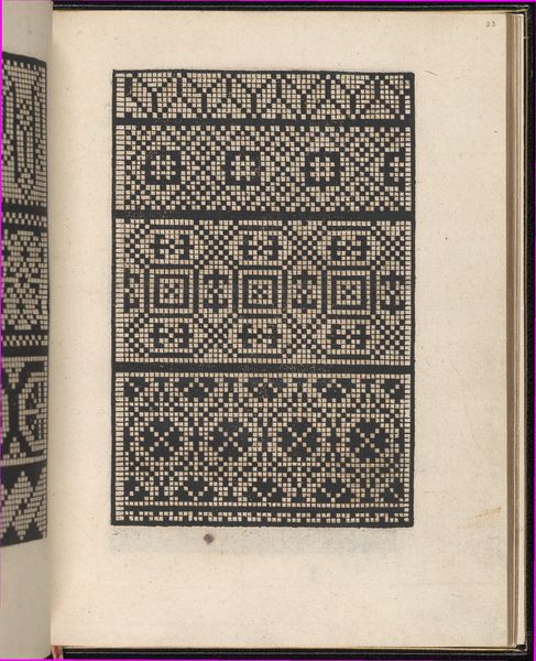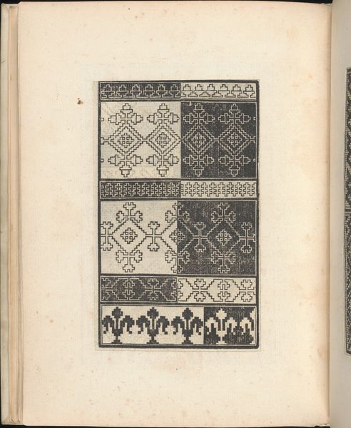 Curator: This page, "Esemplario di lavori, page 8 (verso)," comes from a 1529 engraving by Nicolò Zoppino. It's part of the decorative arts collection here at the Met. Editor: It has this really striking quality... almost hypnotic, with the repetition. It reminds me a little of textile design, even pixel art. Is that intended? Curator: Exactly! These “Esemplari” were pattern books for lacemakers and embroiderers. This one features various geometric designs. The material process – the act of engraving, and its relationship to textile production—becomes a crucial point. This wasn't high art; it was functional, geared toward a specific form of labor. Editor: And primarily women’s labor, right? How did publications like this shape women's lives, both creatively and economically? Did it offer opportunities, or did it further define their roles in the domestic sphere? Curator: I think both. These books certainly reinforced expectations. But they also provided access to new designs, and therefore perhaps a degree of autonomy in creation and consumption. Consider the skill involved—the translation of these patterns to different material surfaces by the lacemakers. It elevates craft, challenging any strict dichotomy between “art” and “craft." Editor: It's intriguing to consider this from a contemporary perspective, too. So much of what we consider design now is also rooted in algorithms and repeatable processes, almost blurring the line between handcrafted and machine-made. How much of an individual's work can be perceived when they engage with reproductive and decorative techniques, and in the past when they followed this pattern? Curator: I think it forces us to re-evaluate what we consider 'originality' in creative output. Editor: It’s amazing how a seemingly simple set of repeating geometric patterns can speak to so many complex issues. Curator: Absolutely. By engaging with the materiality and the context, we can reveal some hidden layers of creativity.