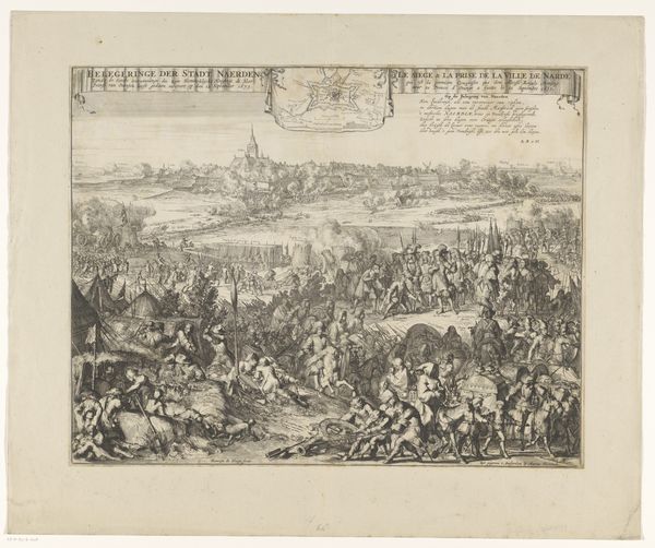 Curator: This print, "Verovering van Grave door Willem III," by Romeyn de Hooghe, dating from 1674, depicts the conquest of Grave during the Franco-Dutch War. Editor: It’s incredibly detailed. I’m immediately struck by the sheer amount of activity crammed into this single sheet. It feels overwhelming, a real depiction of war's chaos. Curator: Absolutely. De Hooghe masterfully combines a bird's-eye view of the city of Grave with scenes of battle and military encampment. Notice the portraits of William III, carefully placed in laurel wreaths on either side of the map. Editor: It's fascinating how the map itself becomes a battleground. What interests me is the labor that went into this. Each tiny line, etched onto a metal plate and then printed—the craft required to create such detail is staggering. Curator: Indeed, the meticulous engraving serves to legitimize William III and his victory, echoing classical tropes of leadership. Consider the symbolism of Grave itself; its strategic importance amplified through this meticulous portrayal. Editor: And think about its distribution. This wasn't just a piece of art, but a means of disseminating political information, crafted and sold, reaching a wide audience, shaping public perception through material form. What paper was used? Where was it printed? The answers would tell us about the printing industry's role during the Dutch Golden Age. Curator: Precisely. This image also speaks to a moment in Dutch history brimming with a renewed sense of self. This isn't just about one city; it speaks volumes about Dutch resilience against Louis XIV. Editor: To think of this as just “history painting” feels reductive, though. It's also material culture. Who commissioned this, and how were they trying to sway public opinion? Curator: Studying prints like this one allows us a peek into the symbology that was used and understood. Every element is designed to evoke specific emotional responses and reinforce certain cultural narratives. Editor: And yet, for all the grandeur it tries to convey, remembering the processes and materials roots this in labor and context that is perhaps more authentic than the idealized image presented. Curator: Yes, examining those perspectives allows us to fully realize the artwork’s function. Editor: Ultimately, considering its impact and how these images can form our understanding of both conflict and material processes.