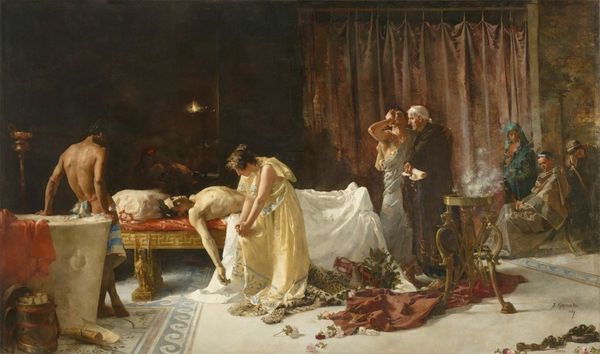 Curator: Immediately, I feel swallowed by dread looking at this scene. The muted colors and shadows heighten the somber mood, hinting at unspeakable tragedy. Editor: Well, it certainly aims to convey a significant weight. This is "The Death of the Pharaoh’s Firstborn Son," an oil painting created in 1872 by Lawrence Alma-Tadema, a painter known for his meticulously rendered historical scenes. Curator: Tadema definitely leans into depicting historical narrative, especially around classical and ancient settings. Look at the composition! He carefully captures the moment, yet all the signs point towards death – a palpable void, like the aftermath of some ancient horror. Editor: The painting taps into a very specific biblical narrative – the tenth plague of Egypt, where God inflicts the death of firstborn sons upon the Egyptians as the final catalyst for the Exodus. This episode has echoed across Western art and culture for millennia, solidifying its position in shared cultural memory. Curator: Absolutely. Think of the sheer symbolism: death as divine retribution, leadership facing loss. Even the single flower that the Pharaoh holds suggests that finality. In the psychology of symbols, flowers often relate to death as a moment of temporary bloom before an ending. And his upright position juxtaposed with the slumped figures accentuates themes of powerlessness in the face of the inevitable. Editor: I agree. It’s intriguing how Alma-Tadema translates that symbolic language for a Victorian audience grappling with its own imperial anxieties. Scenes of empire are not limited to celebrations of triumphs. Rather, works like these presented anxieties about loss, power, and divine mandate, repackaged within grand historical tableaux to comment on contemporaneous issues. Curator: It prompts me to reflect on our obsession with representing grief visually, particularly how societies handle trauma at a grand scale. Even in art, the shared pain becomes its own symbol. Editor: Precisely. This painting functions as a lens. Looking back at the historical plagues, and indirectly pointing a finger at Victorian-era imperial confidence. History gives context to the contemporary moment. Curator: Looking at the composition, one starts to perceive what symbols connect, and through it, emotional responses that transcends centuries and cultures. That is what ultimately moves me about this work. Editor: Yes. It shows the powerful political messages woven within classical paintings like this; something that lingers, even after we step away.