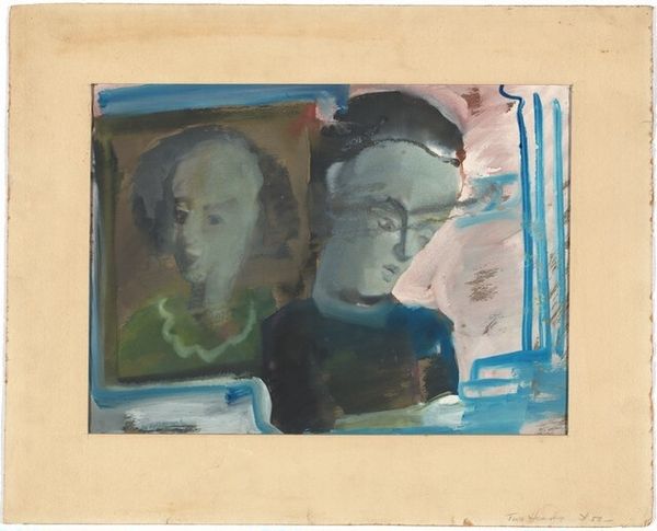 Editor: This is Mark Rothko's "Two Figures Seated on a Sofa." It's a watercolor and drawing piece depicting two people sitting close together. There’s an intensity to the figures… and the face on the right… it’s arresting with that red coloring. What captures your attention when you look at this? Curator: Oh, the red face absolutely grabs you, doesn't it? It's a raw, almost feverish energy radiating from that figure. But for me, it’s also the way Rothko uses watercolor to evoke such vulnerability. Each color seems to bleed into the next, creating this hazy, dreamlike space around them. Do you get a sense of unease, or perhaps a strained intimacy between them? It feels like a glimpse into a private moment, a little too intimate perhaps. Editor: Definitely, I see what you mean. It almost feels unfinished, or like a sketch... is that intentional, do you think? To leave it open for interpretation? Curator: Absolutely. Rothko wasn’t trying to capture likeness; he was trying to convey emotion. The ambiguity allows us to project our own feelings and experiences onto the scene. Who are they to each other? Are they comfortable? Uncomfortable? The lack of detail invites speculation and makes it intensely personal, don’t you think? Editor: I do. I think it's interesting how unfinished aspects force a different kind of engagement. Like you said, projecting our own emotions onto it. Curator: Precisely! It's less about observation and more about emotional participation. I keep finding myself drawn to the contrast of the almost aggressive reds with the cooler blues. There's a tension there. Almost like a silent argument taking place within the composition itself. Editor: Yeah, seeing the artwork and hearing you describe all this really adds so much depth. Curator: Exactly, art is as much in the feeling it creates, it can act like a window for what we feel. It needs viewers like you to keep creating those new meanings.