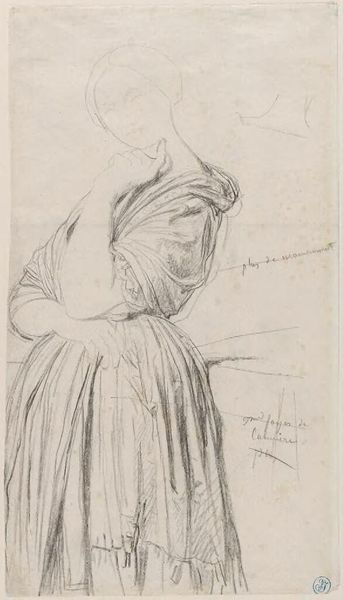 Editor: This drawing, "Two Studies of Drapery" by Jean-Léon Gérôme, features two figures cloaked in fabric. There’s something almost ghostly about their presence. What symbolic meaning do you think the drapery holds here? Curator: Drapery, historically, conceals and reveals. Think of shrouds, or the robes of deities. What feelings does the covered figure evoke in you versus the one with the exposed neck? Editor: The covered figure feels more mysterious, perhaps even ominous, while the other suggests vulnerability or openness. Curator: Precisely! Gérôme may be playing with these associations. He masterfully uses line to distinguish between states of being. Does it remind you of any religious iconographies? Editor: Now that you mention it, the shrouded figure has a similar aura to depictions of veiled saints or mourners. Curator: Indeed, the drapery functions as a visual language, steeped in cultural memory. It’s fascinating how a simple study can evoke such complex emotions. Editor: I never thought of drapery as being so symbolically rich!