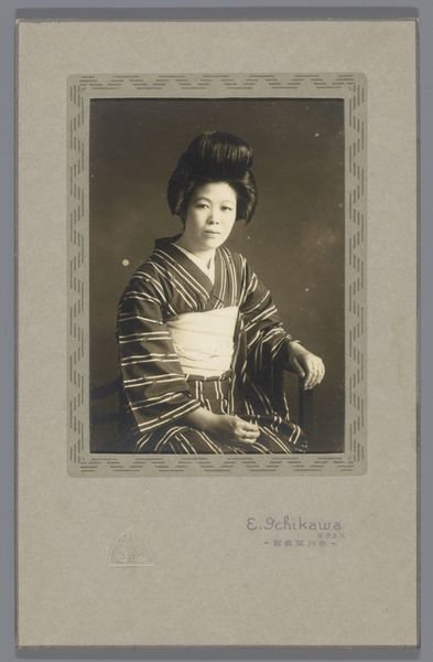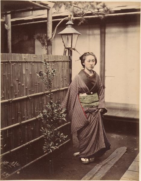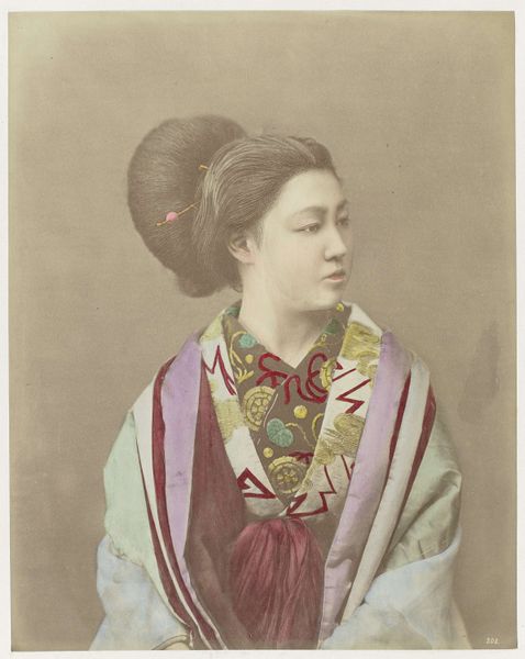 Curator: This photograph, dating from the 1870s, is titled "Tea House Waitress" and was taken by Suzuki Shin'ichi. It resides here at the Metropolitan Museum of Art. What's your immediate take? Editor: She's captivating, and there’s a wistful stillness about her. The muted tones enhance that quiet mood. Curator: Absolutely. It's a hand-colored albumen print. What strikes me is how it embodies the Japonisme movement. We see a real surge of interest in Japanese art and culture during this period in the West. This is less of documentary photograph, and more of a symbolic representation of Japanese femininity aimed toward western audiences. Editor: Interesting. Do you think there’s a subtle commodification there? Presenting her almost as a curated object for Western consumption? Curator: That's a critical point. The positioning and idealization certainly reflect Orientalist views, projecting Western fantasies onto the East. Consider the careful arrangement of her hair ornaments, the stylized pose. These elements speak volumes about cultural expectations and artistic license. It's more of a studio construction than a slice of daily life. Editor: It’s almost like she is styled and curated to represent certain Western preconceptions of Japanese beauty and exoticism. Yet the single white flower is so lovely. And that crimson sash really commands your attention, creating a focal point amid the darker palette. It really pulls you in and disrupts the otherwise muted scheme of color in the piece. Curator: Flowers have traditionally represented femininity. In certain Western contexts, white symbolizes purity and innocence, adding another layer to her perceived role. What is fascinating is to imagine this portrait in contrast with photographs taken by non-Western photographers and in different settings. Then it would show an entirely different reading of womanhood. Editor: It’s a great piece for really investigating the dialogue between art and social perceptions during the era, and that interplay really keeps us thinking. Curator: Precisely, a testament to how photographic imagery from that period really shaped a broader, at times very biased understanding of Japanese society and its people. Thank you for discussing this photograph with me.