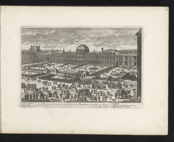 This print of the Versailles stables was made by Adam Perelle in the late 17th century, using engraving techniques. The image is achieved by carving lines into a metal plate, inking it, and then pressing it onto paper, a process demanding considerable skill. The material – metal – allows for a precision and detail that captures the grandeur of Versailles. The texture of the print, the slight impression on the paper, speaks to the labor-intensive process involved. Consider how the print medium itself relates to the social context. Prints like these were a form of mass communication, disseminating images of power and luxury to a wider audience. They offer insight into the labor and resources required to maintain such a lavish display, from the horses and carriages to the staff needed to keep it all running. This print challenges distinctions between art and craft, reminding us that even images of power are constructed through skilled handwork.