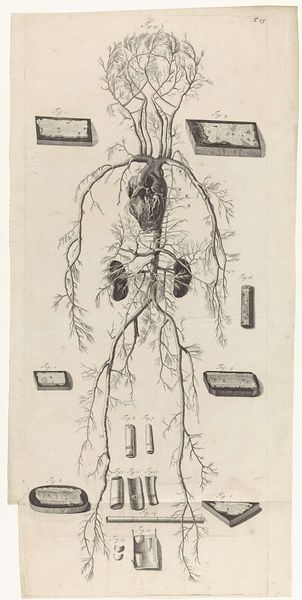 Editor: This is Jake Chapman’s etching, "Exquisite Corpse" from the Tate collection. It's quite disturbing, with this monstrous figure holding severed heads and rooted in the ground. What do you see in this piece? Curator: Chapman, known for pushing boundaries, presents us with a potent symbol of societal decay. The monstrous figure can be seen as an embodiment of corrupted power structures, drawing from historical anxieties surrounding monstrosity and the abject. Consider its relationship to the history of grotesque imagery and its role in critiquing contemporary politics. What effect does the "rooted" aspect have on your interpretation? Editor: It feels like it can't be removed, like these awful ideologies are stuck in place. Thank you for pointing out the historical anxieties; I hadn’t considered that! Curator: Exactly! Art provides ways of seeing these histories and ways of becoming unstuck.
