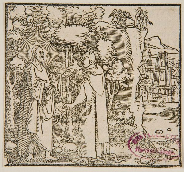 Curator: This intimate drawing, believed to be from the 17th century, is titled "September." Its fine lines capture a slice of life. What do you notice first? Editor: The labor. The way bodies are situated within that landscape feels deeply unequal. A figure carrying what looks like harvested goods walking toward a city while a group harvests from a tree in the foreground. Curator: Precisely. Think about how images like these circulated. Drawings such as this offered a perspective on work and the rhythms of life at a specific historical juncture. The division of labor you mentioned speaks volumes. How do we situate that within gender roles of the period? Editor: Well, notice who is collecting from the tree—there’s one individual climbing, seemingly male, and one who has apparently collected produce. They're assisted by one who appears to be a woman at their side. And the lone figure in the distance also appears to be carrying burdens. The artwork reproduces existing social dynamics while eliding specific experiences. Curator: Right, and considering this artwork dates to the 17th century, the style aligns with Northern Renaissance traditions, emphasizing detailed landscapes and genre-painting, that kind of quotidian focus. Editor: The city backdrop is compelling, acting as both destination and implied engine to that labor. Does that background imply a sense of collective prosperity or suggest class separation? It’s hard to interpret. But thinking about audience is interesting here. What would someone viewing this drawing within a collection make of the scene? Curator: It likely depended on the viewer's position in the social hierarchy. Perhaps a wealthy collector saw the drawing and saw idealized labor practices; another might have a starkly different perspective. This drawing encapsulates the complicated, intersecting dynamics of its time. It's fascinating how a small artwork on paper can hold such layers of social meaning. Editor: Indeed. I find myself pondering the choices that everyday individuals make and how our understanding of past dynamics can better inform present struggles for a more equitable society.