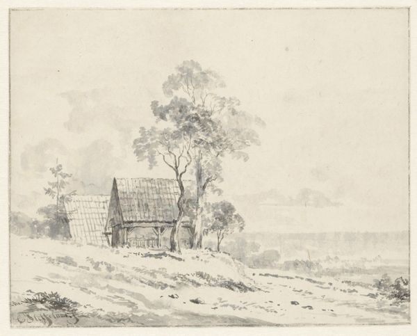 Curator: We're looking at "Farmhouse on a Canal," a pencil and pen drawing created sometime between 1600 and 1630 by Esaias van de Velde. Editor: It has a delicate quality. The shading is gentle, almost atmospheric. The buildings and foliage seem to blend softly. I find the overcast tones very appealing. Curator: Van de Velde was crucial in popularizing landscape painting in the Dutch Golden Age. Before him, landscapes often served as backgrounds for allegorical or historical scenes. He placed ordinary Dutch life front and center, elevating it as a subject worthy of artistic attention. This drawing exemplifies that shift, it's devoid of the overtly dramatic or heroic. Editor: The very choice of a humble farmhouse becomes radical. You have to consider what it meant to depict ordinary labor and rural life amidst the intense social changes. Were these landscapes simply pretty pictures, or could they be quiet commentaries on a rapidly changing world? It’s important to contextualize the increasing urbanization within the painting and acknowledge the political climate that produced these representations of land and ownership. Curator: Exactly. And consider the burgeoning art market during this period. These images tapped into a sense of national identity and pride. There was an economic incentive to show these pastoral views. You can also view this through lens of urbanization: it depicts a space less crowded, more tranquil in the background versus the fast life of the wealthy at that time. Editor: How much were people willing to ignore? To simply enjoy an aestheticized, possibly idealized view of "country life?" This reminds us to reflect on our contemporary desire for art to have overt, politically-charged meaning. Was this quiet resistance or subtle reinforcement of the existing social order? I guess there is never a perfect definition of that time. Curator: An excellent point. So much in history, as in art, resists easy definition. Thank you for helping to contextualize our reflection. Editor: Indeed. The artwork reminds us to keep our focus, encouraging us to contemplate how a simple scene encapsulates far more complicated dynamics than initially apparent.
