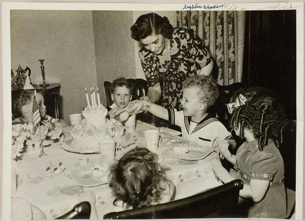 Editor: This is Robert Frank’s gelatin silver print, "Festival—Children," from around 1941. I'm really struck by the everyday nature of the image. It feels so candid, like a snapshot capturing a genuine moment. What jumps out at you when you look at it? Curator: What interests me is the implied social narrative within that apparent candor. The image places childhood, typically viewed as a time of innocence, within a specific historical and cultural framework. Knowing it was taken circa 1941, during the lead up to WWII, shifts my perspective. Are these children preparing for some wartime activity? Do you think the photographic act itself is neutral or has a political role here? Editor: That's interesting. I hadn’t considered the potential tension. Maybe the hammers represent the future labour the children will endure. I thought they might be hitting a dessert, but that does not fit the scene. Curator: Precisely. The ‘innocent’ activity is situated in the context of wartime mobilization of labor, perhaps indicating how societal demands impact even the youngest members. The photographer frames this otherwise simple moment. Who and what get highlighted reveals implicit values of how youth are socially presented. Editor: So, you are saying this isn’t just about childhood fun, but about how society mobilizes even childhood for its own purposes. The composition initially seemed random, but I can see now the power dynamics, especially when thinking of childhood as politically loaded. Curator: Exactly. Photography is rarely, if ever, neutral. Its visual presentation always embeds societal beliefs about representation. Reflecting on how that specific era viewed its own children adds deeper appreciation for this photograph beyond sentimental aesthetics. Editor: This has completely changed how I view seemingly straightforward documentary images. The socio-political angle gives me so much to think about. Curator: Yes, images, and our interaction with images, are not just recordings, but also reveal social codes and narratives from when they were created and viewed.