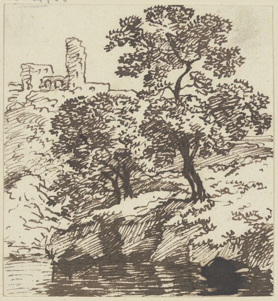 Editor: This artwork by Isaac de Moucheron, titled "Aussicht auf einen Fluss an welchem Gebäude und ein Brunnen stehen, ein Reiter tränkt sein Pferd," which translates to "View of a river with buildings and a fountain, a rider waters his horse" is rendered in ink, etching and drawing. It presents a rather tranquil scene; I am drawn to its layered landscape. What do you see in this piece? Curator: I see a careful construction of landscape, very characteristic of the Baroque period. Artists like Moucheron were less interested in portraying a specific, real place, and more invested in creating idealized visions, reflecting ideas of order and control over nature itself. The etching, as a medium, allowed for mass production and distribution, expanding access to these landscape visions. Editor: So it's less about representing reality and more about constructing an ideal, which would be appealing. Curator: Precisely. Think about who was commissioning and consuming these landscapes: often, it was the emerging merchant class, eager to emulate aristocratic lifestyles and demonstrate their own command of their surroundings, perhaps through land ownership. The imagery itself becomes a tool for social positioning. Consider the horse and rider, this act of caring for the animal seems more romantic than practical, further pushing this aesthetic sensibility. Editor: That makes me think about how even seemingly simple landscape images are deeply embedded in the social and political contexts of their time. How the distribution of this particular art via print making may shape social tastes. Curator: Exactly! We can understand so much about a period by studying its landscapes and how those pictures circulated. Do you find your own sense of place shifting now that you’re more deeply studying Art History? Editor: I think so! I am viewing place and imagery in different ways now; that art creates taste and tells history, and even affects my own way of understanding the world. Thanks. Curator: It’s been my pleasure.