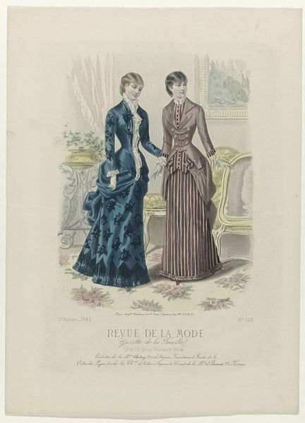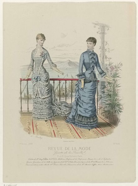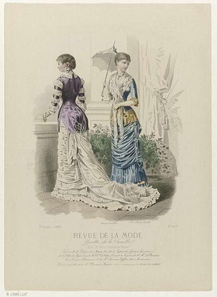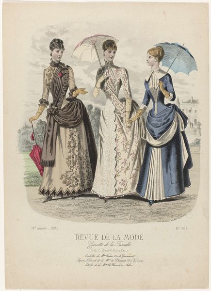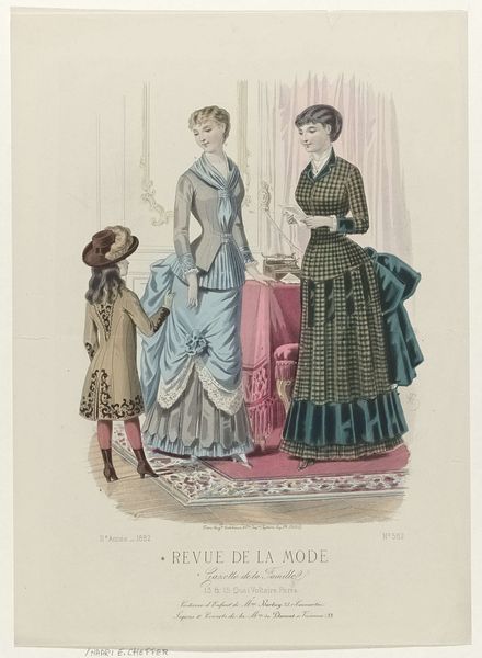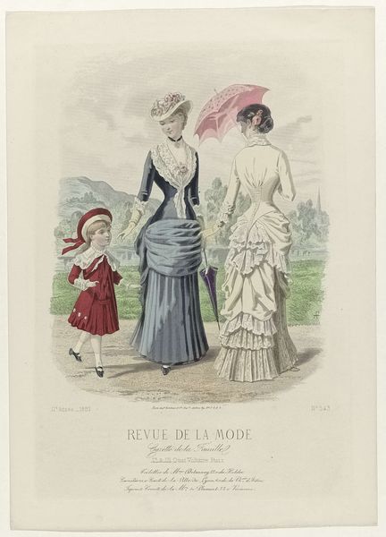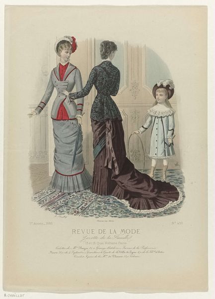 This is an image from the French fashion magazine, “Revue de la Mode”, dated September 11, 1881, and made by P. Deferneville. The image depicts the latest Parisian fashions for women and children. During this period, fashion magazines such as "Revue de la Mode" played a crucial role in shaping and disseminating ideals of femininity and social status. The elaborate dresses with their corseted silhouettes and ornate detailing reflected the values of the upper classes. Clothing served as a visual marker of social identity, with the latest styles signaling one's access to wealth, leisure, and cultural capital. The magazine itself functioned as an institution, reinforcing existing hierarchies by dictating trends and cultivating a culture of aspiration. To better understand the significance of this image, it's helpful to consult sources, such as fashion history archives, social commentaries from the period, and studies of the magazine industry. By examining fashion within its broader social and economic context, we can gain insights into the complex interplay between art, commerce, and identity in 19th-century France.