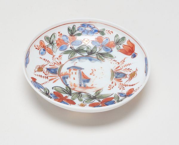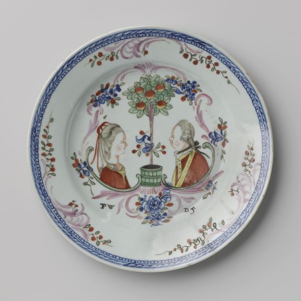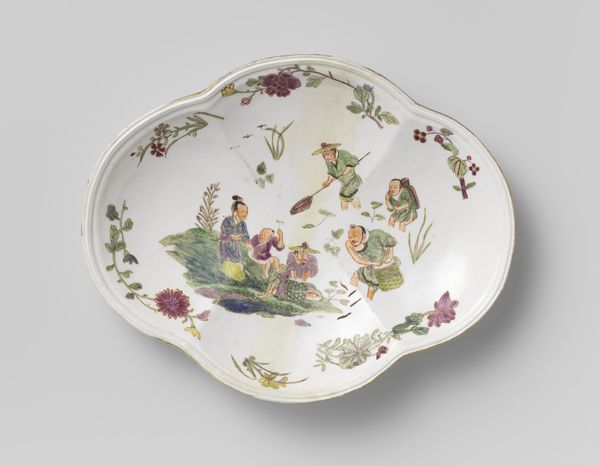 Curator: What grabs you first about this decorated dish, would you say? The frenetic violence in the center, or that incredible floral border? Editor: Definitely the chaos. There's something unsettling about seeing such a visceral scene on a plate. It’s…domestic violence as tableware? It feels both whimsical and deeply wrong. Curator: It does have a disquieting effect. This earthenware dish, created sometime between 1740 and 1760, depicts a scene titled "Dish with Moses Defending the Daughters of Jethro." What are your thoughts on it, Iconographer? Editor: The depiction of violence on everyday objects is always striking, playing on the subconscious link between nourishment and potential harm. The image shows Moses coming to the rescue of the seven daughters of Jethro who were being accosted by shepherds. This particular telling of it emphasizes the protective role of the heroic male figure, a prevalent theme throughout history, that manifests visually as patriarchal values. Curator: You know, it is a beautiful thing, technically. The Rococo influence is so strong. Editor: Rococo as in 'late baroque.' That seems very aligned with the style's goal to use spectacle and beauty to mask its often unpleasant themes. Speaking to the scene again, one might wonder if there is an implicit social critique, or perhaps even approval of violent male protection embedded within the picture, further heightened by the domestic object on which it is printed. Are we being served righteousness on a platter here? Curator: I hadn’t thought of it that way! The whole scene is definitely ripe with dramatic tension, and yes, this particular arrangement, upon the dining ware… How do you think viewers back then responded to it? Editor: It depends. Some likely interpreted it literally, as a valorous deed— Moses standing up to bullying shepherds and thus rescuing women, reflecting an ideal of masculine strength. Others may have observed this representation ironically or allegorically. I can see it serving to reinforce religious and gendered narratives, though I hope a few paused long enough to critically assess its implications, even then! Curator: It’s an intense scene presented in a rather delicate medium and artistic style, an interesting tension indeed. I certainly view it very differently now, knowing its underlying commentary. Editor: Precisely! That's the enduring power of art: prompting reflection, inviting interrogation, even across centuries and cultural divides. Even a ceramic plate of this vintage.