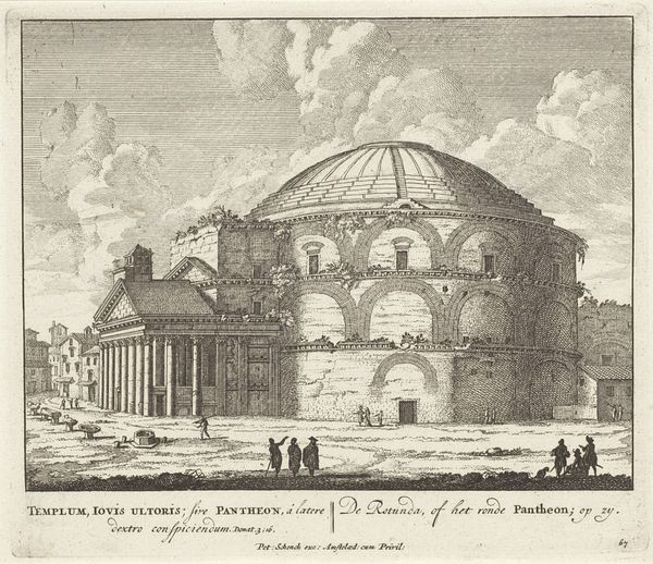Domenico Montaigù's "Fontana dell'Acqua Paola te Rome" is an engraving that captures the stark monumentality of the fountain against a backdrop of the Roman landscape. The composition is dominated by the fountain's architectural mass, rendered through precise lines that define its rectangular form and the rhythmic arches from which water cascades. The materiality of the stone is suggested by the detailed hatching and cross-hatching, creating a play of light and shadow. The print is structured around contrasts, from the detailed architecture to the more loosely rendered figures in the foreground. This juxtaposition invites us to consider the relationship between human activity and monumental structures. Semiologically, the fountain functions as a sign of power and civic pride, a display of Rome's engineering prowess and artistic ambition. Montaigù’s print serves not merely as a depiction but also as a statement about the values and aspirations of the society that produced it. The formal qualities of the artwork communicate the cultural and philosophical ideas of its time. It also invites ongoing interpretation, reflecting how our understanding of art evolves with each new encounter.
