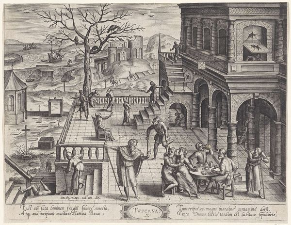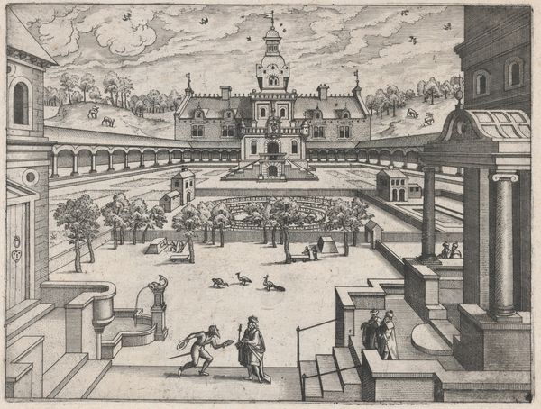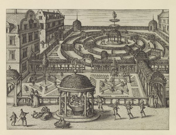 Editor: So, this is Antonio Tempesta’s "April: A Garden," an engraving from around the late 16th or early 17th century. It seems to depict an idealized, ordered space, but also one teeming with different kinds of labor and leisure. What do you see here? Curator: I see a carefully constructed tableau reflecting early modern power structures. The elite stroll amidst the labor of others; the garden becomes a stage for displaying social hierarchy. Consider how Tempesta's rendering of the landscape embodies ideologies about controlling nature and, by extension, controlling people. Editor: So, the garden isn't just a pleasant space, but a symbolic one? Curator: Precisely. What does this curated space say about the relationship between the ruling class and those who maintain their lifestyle? How does it reflect contemporary colonial exploitation of natural resources and labor? Editor: I see. It makes me think about the environmental and social costs of such displays of wealth. Curator: Exactly. Art like this, while seemingly decorative, provides insight into a complex web of power, labor, and environmental manipulation. Editor: This really opens my eyes to looking at art with a more critical lens!