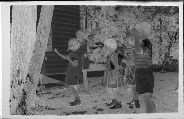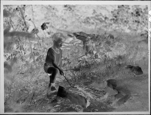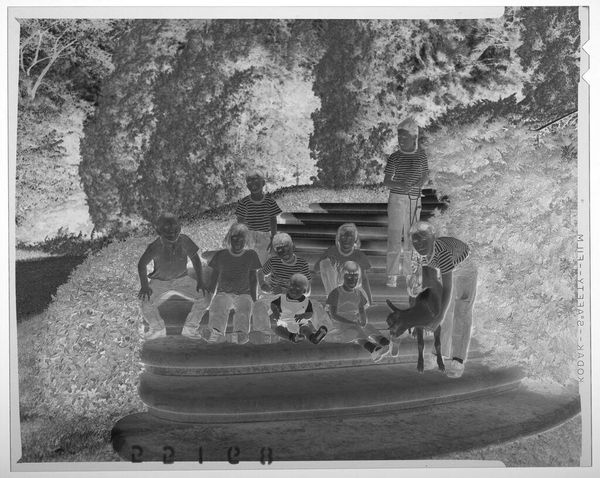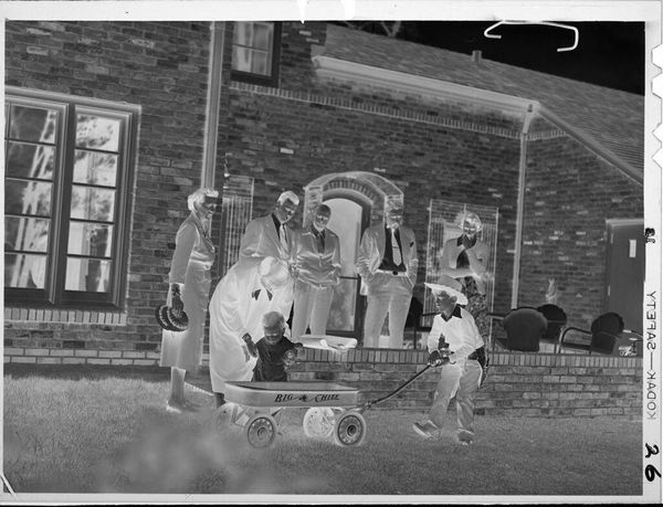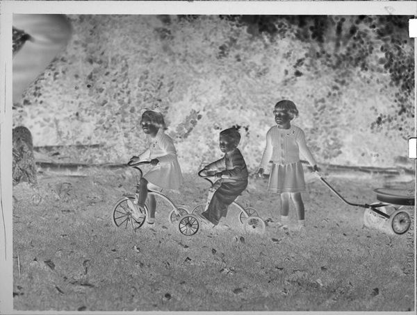 Curator: This striking negative photograph, taken by Lucian and Mary Brown, features a girl pulling children in a wagon. It’s a small gelatin silver print, only about 3 by 4 inches. Editor: My first impression is that this feels like a dream. The inverted tones and the children's expressions create an almost otherworldly quality. I’m immediately drawn into this nostalgic scene, like a half-forgotten memory. Curator: The wagon itself is such an archetypal toy, isn't it? Almost like a vessel carrying youthful joy, but also the burdens of childhood, pulled by the slightly older girl. Editor: Absolutely. The wagon can symbolize support and the cyclical nature of relationships and care. But the negative tones also give it a ghostly edge, reminding us that these fleeting moments of childhood are ultimately impermanent. Curator: I wonder what the Browns were hoping to capture? Is it a study of childhood, an exploration of form, or simply a loving snapshot? Editor: I think it's all those things, swirling together. There is the pure joy of play mixed with the inevitable passing of time. It is a beautiful, bittersweet piece. Curator: Yes, the play between shadow and light seems to whisper secrets of both exuberance and the solemnity of being.