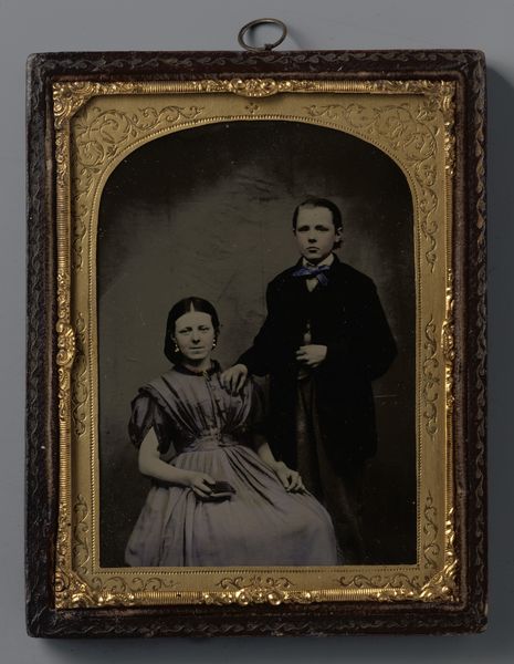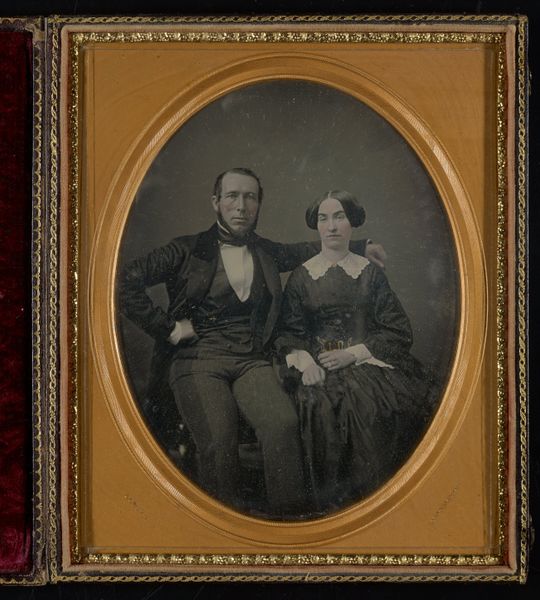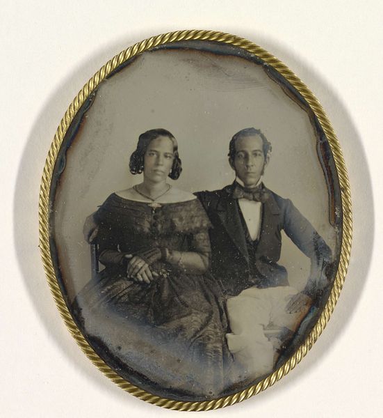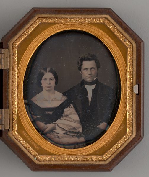 Editor: So, this is an *Untitled* daguerreotype, probably from somewhere between 1839 and 1899. The Art Institute of Chicago just lists it as anonymous. I am immediately drawn to the ornateness of the framing – all that gilded floral detail. What speaks to you when you look at it? Curator: Well, darling, imagine holding history in the palm of your hand! Isn't it wonderful how a tiny object can be so very telling? I mean, forget the *Mona Lisa* for a moment, what about the stories embedded in everyday life? Look closer. It's a study in contrasts – the dark clothing, almost merging into the background, set against the ornate, light-catching frame. A certain austerity paired with unapologetic opulence. Almost feels like looking at two different souls intertwined, doesn’t it? Do you feel that contrast? Editor: Definitely! It feels almost… performative? The couple seems so serious, but then the frame is trying to distract you with its shiny details. Curator: Precisely! Perhaps that seriousness *is* the performance. Daguerreotypes were such a novelty then; imagine the *solemnity* of sitting for one! It wasn't like whipping out a smartphone for a selfie. It’s also like gazing into a looking glass that reminds you you’re peering into their long-ago yesterday. A memory box, don't you think? What do you suppose they felt as that image imprinted? Anxiety, hope, trepidation? It's delicious! Editor: That’s a fantastic point. The preciousness of the process really reframes the image – pardon the pun! I hadn’t thought about it that way. Curator: Darling, the best art always reframes *something*. It’s like life—glimpsed anew through a perfectly peculiar window. Editor: I agree. I’ll never look at another daguerreotype the same way again.