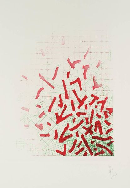 Curator: This is an untitled piece by David Leverett, currently held in the Tate Collections. Editor: At first glance, it seems chaotic—a dense thicket of red, green, and grey lines. Curator: Note how the lines are arranged within a clearly defined rectangular frame. The work reveals a tension between order and disorder. Editor: Absolutely. The colors evoke strong emotions, especially the red, which historically represents life force, passion, and at times, even aggression. Curator: The interplay of the line qualities is critical—their direction, density, and color create a visual rhythm that structures the work. Editor: Perhaps the combination of red and green suggests the natural world, of growth but also decay. Curator: A valid interpretation. It's fascinating how Leverett uses this visual language to evoke a sense of contained energy. Editor: Indeed. The piece invites us to find meaning within what appears to be abstraction, a kind of controlled explosion.