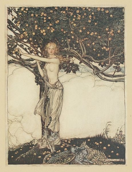Arthur Rackham created this illustration using pen and ink and watercolor. It presents a scene dominated by the iconography of distress and supplication. The daughter's upward gaze and outstretched arms echo ancient gestures of pleading, seen in countless depictions of mythological and biblical scenes across millennia. Consider how similar poses appear in images of the Virgin Mary, her hands raised in grief or intercession, or in the figures of supplicants before a king or deity. The fur-clad father figure, adorned with a feathered helmet evoking a sense of noble barbarity, embodies a stoic masculinity. Yet, his slumped posture conveys a deep inner turmoil. These symbols evoke the emotional power of familial bonds tested by unseen forces, resonating with our own subconscious anxieties and desires related to protection and vulnerability. Just as these symbols transcend time, so too do our deepest fears and hopes regarding family. They resurface in new forms, carrying echoes of the past into the present.