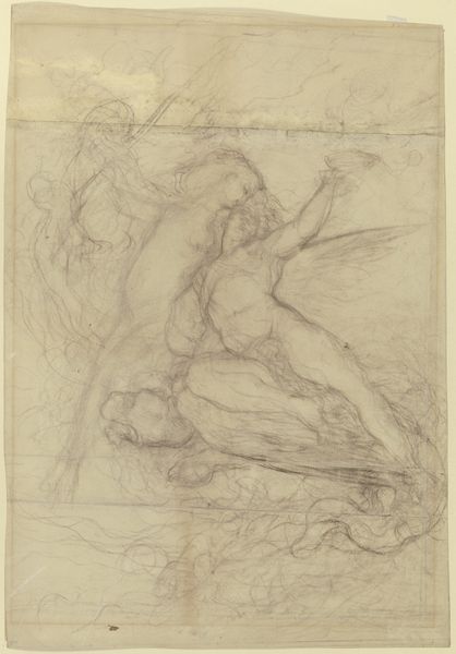 Curator: I find this Victor Müller drawing absolutely captivating, it is named "Männlicher und weiblicher Halbakt in antikischer Umgebung, dar\u00fcber schwebend ein Harfe spielender Putto", the title itself speaks to this airy composition with a male and female figure below an angel. What catches your eye first? Editor: It feels… unfinished, but that’s part of its allure. The hazy, dreamlike quality makes it hard to grasp, but you can get a feeling for this mythological past that seeps out of the paper. There's also a raw intensity in the figures; their very forms are sketched and urgent. Curator: Yes, precisely. It is a chalk and pencil drawing on paper that really speaks to an ancient ideal form and almost illustrates an unfolding scene, full of longing and perhaps even foreboding with that cherubic figure hovering above. It is reminiscent of sketches for much larger historical paintings. Editor: The angel almost reads as an ambivalent Cupid figure hovering above the man and woman. It brings up ideas of divine intervention versus fated love, and how those narratives were essential for historical understanding and cultural continuity through Classicism. It's not just about bodies; it's about archetypes. Curator: I can appreciate the Cupid association but find myself really stuck on this idea of "preparation". A step before the real piece so to speak, there is such incredible artistry here and I wish that Müller would have finished this one; what impact! Editor: That almost incompleteness, though, encourages imagination, like filling in the emotional context or larger story surrounding the figures, a key factor that makes sketches and the act of practice and observation that informs a creative through line timeless, don't you think? The rough sketch contains multitudes, more possibilities. Curator: Absolutely. It speaks volumes without uttering a single, definite word. And from this little piece we can gather a new appreciation for form. Editor: For me it's more that through seemingly simple forms, we can reveal incredibly complex narratives about identity and the continuation of cultural memory.