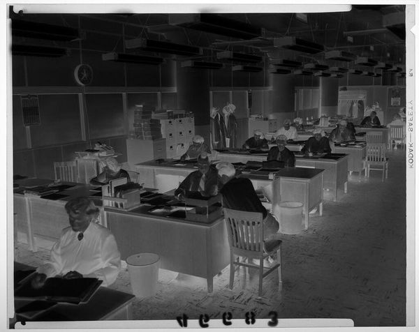 Curator: This intriguing photograph, by Jack Gould, captures an "Untitled" scene of an elementary school classroom. The dimensions are roughly 4 by 5 inches. It feels instantly haunting. Editor: Indeed. The image's inverted tonality gives the scene an eerie, almost dreamlike quality. The rows of desks and children become a study in uniformity. What do you see as most striking about the artist's approach? Curator: I'm drawn to how the photographic process itself shapes our understanding. The negative image emphasizes the material conditions of early education: the desks, the lighting fixtures, the teacher as a kind of overseer. Consider the historical context, the implicit politics of learning environments. Editor: Absolutely. The photograph invites reflection on the standardization of education and the role of institutions in shaping young minds. The medium accentuates a feeling of constraint and conformity. The reversed tones give this feeling of constraint even more weight. Curator: It makes you consider the physical space of learning and its impact. It's a powerful testament to the weight of the past within present structures. Editor: A chilling reminder of the systems at play in even the most seemingly innocent spaces.