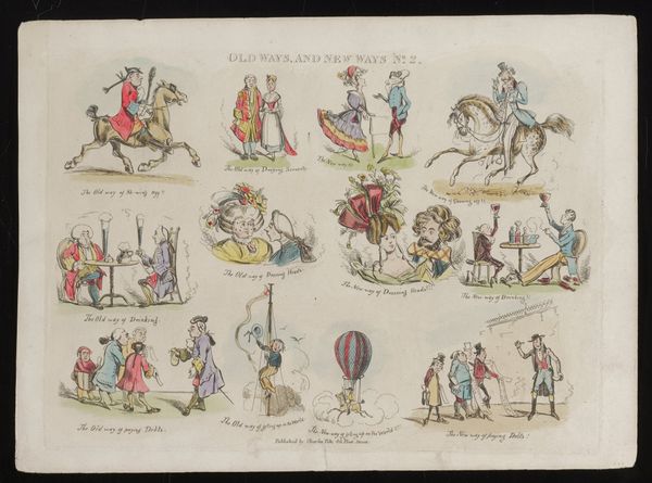 Curator: Andreas Geiger created this lithograph in 1843. It’s entitled “Vijf scènes op het gebied van kunst en cultuur,” or “Five Scenes in the Realm of Art and Culture.” It gives us a charming glimpse into Viennese life during that time. What strikes you first about this piece? Editor: My initial impression is one of compartmentalization and pastiche. It's like a mood board for the burgeoning cultural industries of the mid-19th century. I am curious what you would make of all the implied divisions. Curator: I think the composition speaks volumes about the cultural landscape at that time. The way each vignette is separated, almost like postage stamps on a larger sheet, emphasizes the burgeoning specialization within the arts. You have ‘Kunst,’ ‘Literatur,’ ‘Musik,’ ‘Mode,’ all neatly boxed in, while Vienna proudly displays itself as the cultural hub, like the heart of it all. I see these distinct zones coming together under one broad canopy. Editor: Ah, interesting point. I’m also intrigued by the prominent display of text intermingled with the illustrations. The very lettering is treated as an art form. Do you feel that the inclusion of 'Wiener Allgemeine Theater-Zeitung' at the top speaks to its function as an advertisement or announcement, turning it into an almost postmodern piece? Curator: Absolutely, this was advertising. It promoted the theater and more broadly, the arts scene in Vienna. Think of this as a very elaborate advertisement, meant to capture attention. Geiger cleverly incorporates elements of genre painting to give viewers a peek into the lives of artists, musicians, and writers. And his embrace of romanticism makes us feel its nostalgic tug for the past and imagined pasts, combined with a yearning for something bigger and further beyond reach. Editor: I agree. This lithograph acts as a capsule of the Romantic spirit. The scenes hint at larger stories, inviting the viewer to fill in the blanks with their own imaginations. The figure looking into that peep box—the Kaiserspanorama or similar optical entertainment, a late 18th, early 19th century VR headset–is a particularly compelling and mysterious detail. What do you imagine someone experiencing while turning that crank? Curator: That's wonderful observation! Looking at that small scene with such keenness reminds me of trying to conjure whole worlds from small stimuli, finding magic in mundane reality, but for an entire viewing crowd, and doing so in 1843! The printing’s division and seeming promotion, that nostalgia with modernity mixing together–the artist asks the viewer what this explosion of human creativity really MEANS. What’s the value? What’s the trade? The beauty? All there for just a look, an admission price, a subscription? Editor: Well, it certainly inspires contemplation of those contrasts, and how little our culture of production and dissemination has changed in almost two centuries. Thanks! Curator: Thanks! That peep show calls me in!
