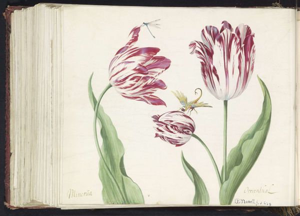 Here, Jacob Marrel has captured two tulips with dragonflies and a ladybug in watercolor and gouache. The tulips, particularly during the Dutch Golden Age, were symbols of prosperity and ephemeral beauty, reflecting the transience of life. Notice the dragonflies. These delicate creatures, often associated with transformation and adaptability, remind us of the constant flux of nature and the soul’s journey. Dragonflies appear in ancient mythologies as symbols of illusion, messengers, and even the souls of the dead. Similarly, the ladybug—a symbol of good luck—perches delicately on a leaf. This humble insect has been seen across cultures as a protector, a bringer of fortune. The composition evokes a deep, subconscious connection to the natural world, touching on our primal understanding of life, death, and rebirth. The symbolism in Marrel's work invites a deeper contemplation of nature’s enduring power and its reflection in our own human experience. Through Marrel’s depiction, these symbols are not static, but dynamically engage with our collective memory.