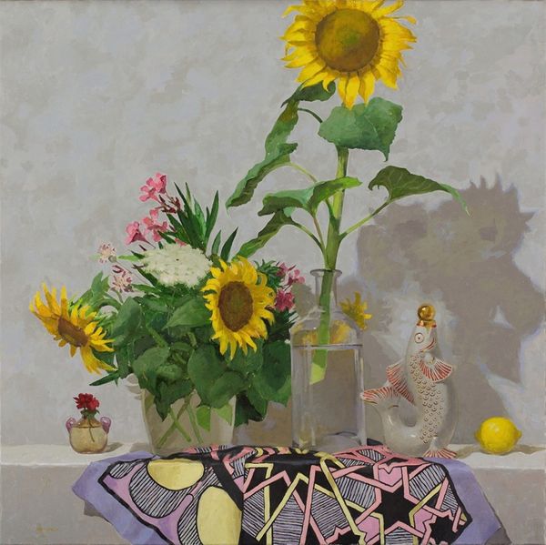Curator: So, we’re looking at a still life, titled "The End of Summer." It is an oil painting rendering a vase of sunflowers, bearing the hallmarks of modernism and distinguished by visible impasto brushstrokes. What is your first take? Editor: My immediate reaction is one of melancholy, despite the sunflowers. They’re gorgeous, but there’s a sense of wilting, a fading brilliance…that evokes nostalgia, and perhaps a touch of regret. Curator: That resonates. Sunflowers are incredibly evocative; universally read as a symbol for adoration, longevity, and even spiritual knowledge. The play of light is a major visual motif here, and these objects symbolize both death and rebirth. I’d even consider its relationship to earlier vanitas paintings! Editor: Exactly. Think about the history of sunflowers themselves. Introduced to Europe from the Americas, they carry stories of colonization, trade, and the transfer of knowledge – sometimes violently. This piece can connect with intersectional stories tied to colonialism, environmentalism, agriculture and class. Curator: An excellent point. The bouquet itself becomes a symbol, too. Placed on what appears to be an austere tiled surface and situated beneath a window partially blocked by a white curtain…there is a lot to unpack here! The arrangement mirrors how our cultures curate nature itself. It is mediated, presented, carefully, for maximum affect. Editor: It feels staged in a way, a memorial tableau perhaps. The window suggests possibilities beyond the canvas’s boundary, while the wilting blooms pull us back to the present moment, to an awareness of decay. Where and how can we make space to value experiences more holistically, before their “end?” Curator: The title of the work frames our whole perception, right? The end. Symbolically, the setting sun always suggests that potential, too; the chance to greet another dawn after darkness. The painting uses symbolism to frame a moment of transformation. Editor: Ultimately, despite my melancholic interpretation, this work speaks volumes about resilience and continuity, and invites conversations regarding human relationship with ecological transformation. Curator: Indeed. What seemed a mere "still life" unveils a powerful exploration of cyclical time. Editor: Right, art as both mirror and lamp!