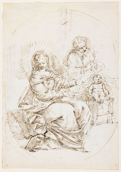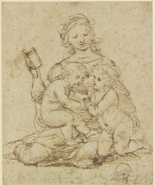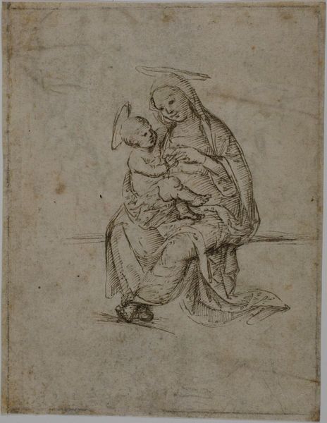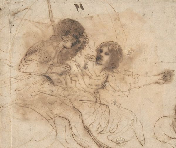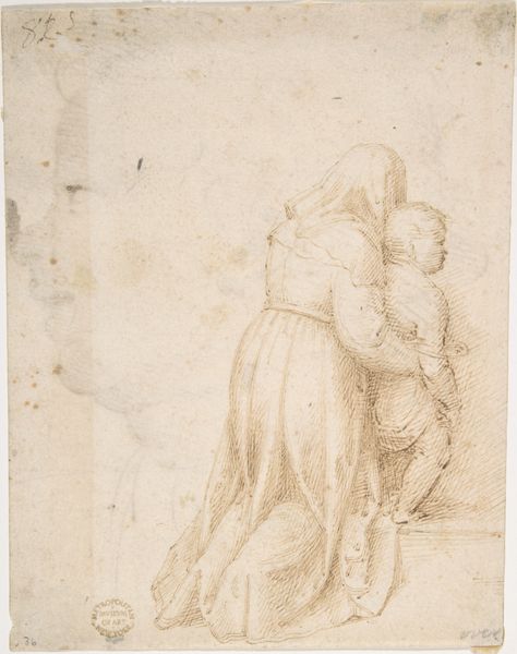 Curator: Here we have Francesco Allegrini’s “Mother and Child,” a work likely created sometime between 1624 and 1663, rendered with pen and ink. Editor: My initial response is one of intimacy. The figures, though sketched with seemingly quick, simple lines, convey such tenderness in the mother’s gaze. Curator: Absolutely, the iconography of the mother and child is deeply ingrained in Western art and often linked to depictions of the Madonna and Child, emphasizing themes of divine love and the sanctity of motherhood, ideas heavily circulating and celebrated through Europe during Allegrini's lifetime. How the public engages with those tropes here would certainly shape the painting's overall reception. Editor: The dynamism achieved with such economical means is striking. Notice the convergence of lines drawing our eyes to the child's face and its gesture toward the mother's hand, underscoring that powerful connection. Even the hatching of the garments, done with varying density, directs light and form, creating a sculptural effect within the two-dimensional plane. Curator: And that is certainly purposeful, reflecting back to the social emphasis placed on maternal roles, where motherhood and piety were essentially the gold standard for women of this time, and therefore a highly marketable commodity for Allegrini's patrons. One wonders to what extent the formal beauty amplifies the intended message. Editor: One could even read a sense of Baroque dynamism into it; though only suggested, the scene implies movement and energy typical of that period, achieved largely through that directional penmanship. The contrast created by light and dark tones against the background helps provide a striking image. Curator: Considering its accessibility via prints, such imagery also allowed the church to reach wider audiences and encourage specific roles within the public sphere. These artistic representations served as tools to shape the domestic lives of the faithful, influencing how family relationships were valued and enacted within the broader culture. Editor: Thinking about it now, the simple composition further adds to the emotion of the figures in the foreground, helping them to more strongly emanate universal connection and familiarity across different viewing eras. Curator: True, seeing Allegrini’s piece within the Met provides an opportunity to reflect on not only the artistry itself, but also its original intention as a cultural artifact, designed to interact with a complex social reality. Editor: Indeed, studying its composition, media, and how that speaks to universal experience reminds us about our human connection as a collective.