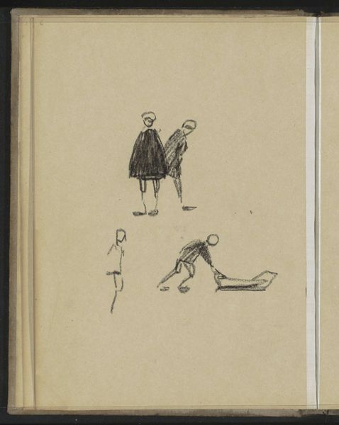Curator: This pen drawing is called “Studieblad met vier figuren,” or “Study Sheet with Four Figures” by Willem Witsen. It’s believed to have been created sometime between 1892 and 1897 and currently resides here at the Rijksmuseum. What are your first thoughts? Editor: Sparseness. There's a minimalist energy, but also something quite vulnerable about these sketchy figures on a toned piece of paper. They look like hurried impressions. Curator: Indeed. The social and historical context is that these sorts of drawings came from Witsen's sketchbooks, filled during his involvement with the Dutch impressionist movement and the artistic circles that coalesced around figures like George Breitner. Editor: So, how might we interpret this through the lens of identity and representation? Do these anonymous figures represent a broader segment of the population? The everyman? Curator: It's intriguing to consider these sketches within the broader socio-political landscape. Impressionism itself was a departure from academic painting. Witsen and his contemporaries aimed to capture fleeting moments of contemporary life. It’s like a turn toward capturing raw and immediate experience. Editor: I wonder what Witsen sought to convey with such spare depictions. Is there a critique of social rigidity in presenting individuals so devoid of detail? It makes me think about performativity and how we present ourselves in public. Curator: The choice of toned paper and pen contribute to the sketch's intimacy, something many forget that are actually carefully calibrated, technical choices. This contrasts with the highly polished portraits that would typically capture the elite classes. His imagery offers us a democratized vision of Dutch society, focusing on the everyday. Editor: Thinking about it, this simple page invites us to fill in their stories, maybe even see reflections of ourselves, despite being created in the late 19th century. Curator: Yes, through this study, Witsen documented society with his specific lens, making “Studieblad met vier figuren” both of and beyond its time. Editor: Well, this quick dip into Witsen’s sketchbook offers much for contemplation, it certainly has made me think a little differently.
