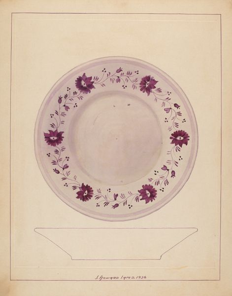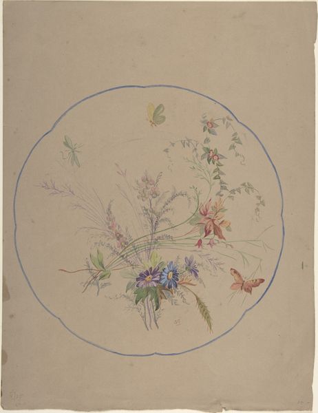 Curator: We’re looking at a 19th-century piece currently held at the Metropolitan Museum of Art: "Design for a Fruit Plate." It's rendered using watercolor and ink on paper. Editor: My first thought is… understated elegance. There’s something incredibly gentle in its presentation, from the wispy watercolor washes to the balanced composition, a near-perfect circularity. Curator: The beauty truly does lie in the details. Notice the composition—the rhythmic alternation of paired leaves and clusters of berries creating an ornamental ring. It suggests an engagement with botanical studies common at the time, translated into a design context. Editor: Agreed. The technique highlights a distinct approach to craft, seemingly at the intersection of utility and art. One has to wonder about the availability of pigments; the blue-green hue and singular shade of red suggest certain restrictions perhaps informing a creative response, almost improvisational. The design certainly reflects that material-conscious choice. Curator: And what about the symbolic nature of fruit and leaves in design? It evokes ideas of abundance and natural harmony, a fitting aesthetic choice for something intended to hold fruit. Its simplicity is key. The thin, consistent yellow circle provides definition without overwhelming the delicacy of the watercolors. Editor: From my point of view, this whispers about production and consumption habits of the 19th century. Imagine the socio-economic standing that permits a meticulously designed, rather than merely functional, plate. Was this a luxury item, handmade for a specific patron or intended for broader, industrial reproduction? Curator: The precise repetition of the leaves and berries would lend itself nicely to mass production, although this original is definitively hand-drawn. What truly stands out is the piece’s formal integrity— the skillful use of symmetry, color, and form to create a design both visually pleasing and conceptually rich. Editor: Absolutely. When considered as a blueprint for a final manufactured piece, one might then appreciate its directness: the economy of gesture, restricted material use. A potent, graceful design brief awaiting translation into something tangible. Curator: It's certainly been fascinating to view this artwork from our two vantage points, it highlights both the intrinsic artistry and the surrounding socioeconomic circumstances. Editor: Indeed, bringing greater context to our appreciation. It has brought added nuance to what I previously thought was a simple and pretty watercolor.