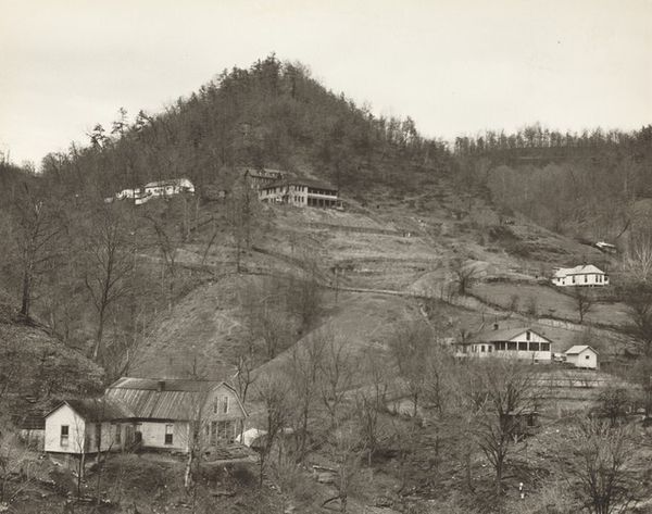 Curator: We’re now looking at “Near Johnson City, East Tennessee,” a photograph taken by William Eggleston in 1984. Editor: There's a stillness here, almost melancholy. A lonely barn sits in the middle of the frame, nestled in a vast expanse of rolling green hills, like an artifact, a relic. Curator: Eggleston elevated color photography from commercial work into a serious art form. Notice how he captured seemingly ordinary, even banal, scenes with an almost painterly sensibility. The shadows, the light on the hillsides, the dilapidated structure... they all converge, speaking to the passage of time and memory. Editor: That decay is definitely palpable. It makes me think about rural displacement, the decline of family farms in the late 20th century, and the quiet desperation underlying the beauty of this landscape. What was once an idyllic agrarian landscape is haunted by a sense of abandonment and what has been lost through capitalist sprawl. Curator: Absolutely. It echoes the iconography of decline we see across various cultural symbols. Barns like this hold collective memories of sustenance and labor, family ties and survival, which makes the fading beauty so striking. There's a symbolic power in these architectural remains and they become visual shorthands for the rural American experience. Editor: I think there's an implication that, by photographing the seemingly unremarkable, Eggleston subtly confronted ideas of economic power and societal change that often go unseen. He holds these subjects to the same standards of aesthetic relevance of other cultural products of its time. Curator: True. We attach importance and meaning to objects—a dilapidated barn, a lone tree—and through these, to larger themes. It speaks to the continuity of human experience and the layered stories our landscapes hold. Editor: This has been a powerful reflection on what an artist captures through an everyday subject. We must not be limited by their intended scope but look at its relation to social reality. Curator: I agree completely. Images have inherent resonance; and examining Eggleston’s perspective here, helps expose so many latent histories.