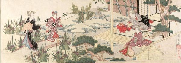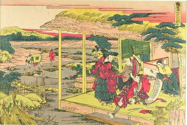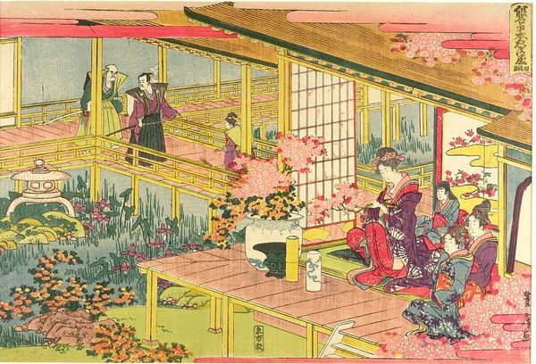 Curator: The scene feels strangely serene given the figure poised to strike with a sword. Editor: Indeed. This is Hokusai's "Act II (Nidanme), from the series The Storehouse of Loyal Retainers, a Primer (Kanadehon Chūshingura)." We see the stark contrast between the exterior and interior, a common theme reflecting social tensions. Curator: The woodblock printing itself is remarkable. Notice the layering of colors, the carving—the tangible evidence of Hokusai's process. It's not just an image; it's a crafted object. Editor: And that craft serves a purpose. This series engages with themes of loyalty and sacrifice. The figures are not just aesthetic forms; they embody social roles and expectations in Edo-period Japan. Curator: I see the blurring of boundaries. Hokusai elevates what some might consider a "low" craft into high art through his technical mastery. Editor: Exactly. It's a strategic move, engaging with popular narratives to subtly critique the very power structures that upheld them. The labor embedded in this piece makes it so potent. Curator: I appreciate how exploring the printmaking process allows us to consider the societal forces at play. Editor: By situating this work in its socio-historical context, we can better grasp its lasting resonance and impact.