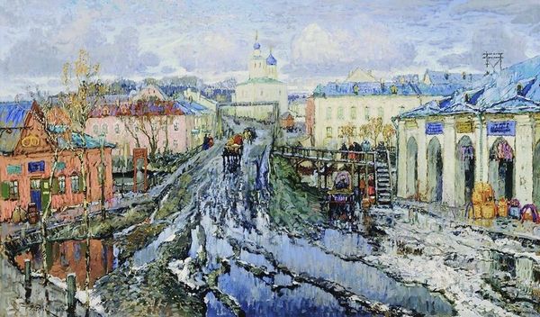 Konstantin Gorbatov made "The Harbor" with oil paint on canvas in 1920. The visible brushstrokes and textured surface show that Gorbatov applied the paint with expressive energy. Notice how he layers different colors to create a sense of depth and light. These impressionistic techniques reflect the influence of modern art, yet they also point to a broader historical context. The painting is a window into the working life and the culture that surrounds it. The artist captured the essence of a place shaped by labor, trade, and daily life. This wasn't just about aesthetics, but rather about showing the cultural traditions and the social and economic dynamics of the harbor. By looking closely at the artist’s materials, techniques, and subject matter, we gain a deeper understanding of the historical narrative, challenging our preconceived notions about art.