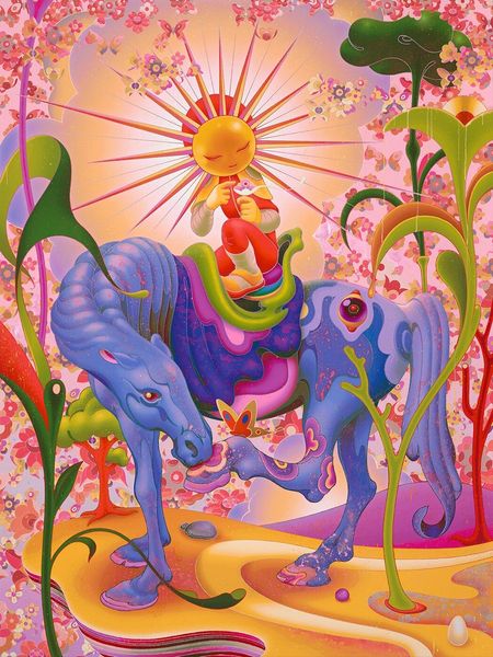 Here, James Jean asks us to look at the world through the eyes of a sun god, in what I imagine were bright acrylics. The colours are vivid, almost psychedelic, and the lines are smooth, like something out of a dream. I love how the colours clash and blend, creating a strange, vibrant harmony. Notice the bright pinks and blues in the lower register, how they create a kind of carpet from which the horse’s legs sprout. The texture is incredibly flat, with a graphic quality that reminds me of comic books or animation. In the face of the sun god, we see how the artist plays with light and shadow, creating a sense of depth and volume. The work makes me think of other artists who have explored similar themes of nature, mythology, and the psychedelic experience, such as Henri Rousseau or Hilma af Klint. But, ultimately, Jean’s vision is unique and unforgettable, inviting us to enter a world of imagination and wonder.
