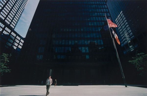 Editor: We’re looking at Harry Callahan’s photograph, “Perspective Distortion: Building Facade and Blue Sky, Atlanta," taken sometime in the late 1970s. The perspective feels so exaggerated; it makes me feel like I'm tilting backwards just looking at it! What’s your take on why Callahan chose this viewpoint? Curator: Oh, I just love how Callahan messes with our sense of space here, doesn’t he? It’s more than just a building facade; it’s a game with perception. It almost feels as though he wanted us to feel the skyscraper's hugeness in comparison with our bodies, and the people that seems like are about to get flatten walking on the side walk... don’t you think so? The geometric details start dancing and changing size! And, goodness, the blue of the sky becomes so piercing, almost mocking the cold architecture. Editor: I see what you mean. It's more than just documenting a building; it's about capturing a feeling. Curator: Exactly! Callahan’s photography often explores that thin line between documenting reality and showing how he *feels* about it. It becomes so emotional, almost as real as a dream, I might add! Are we seeing the world or how the artist experienced it, I wonder... What do you think? Editor: I never thought about photography as having this ability to make dreams visible! Thanks. Curator: The pleasure is all mine. It just feels nice to stop thinking about the right angle, to explore what perspective can mean to you. Just pure, simple... feeling.
