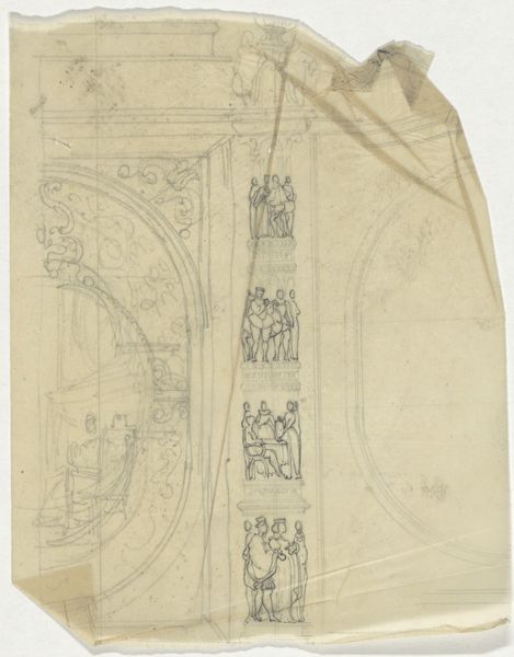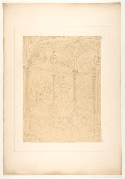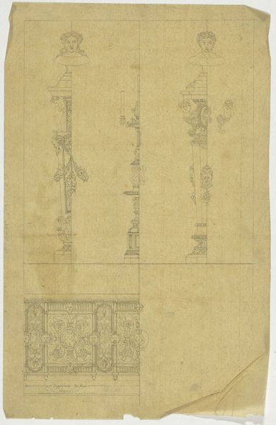 Curator: Here we have "Two Architectural Studies," an ink and paper drawing, potentially an etching, by Lattanzio Gambara, dating back to the Renaissance period. Editor: My first impression is that it's tentative. These aren't bold statements of architectural vision, but rather quiet explorations of form. What strikes you about its structure? Curator: The linework, certainly. Gambara uses line not just to define edges, but to suggest volume, depth, and the play of light. Note how the density of the hatching implies shadow, giving form to otherwise spare geometric shapes. It's a fascinating dialogue between precision and fluidity. Editor: Indeed. And in that fluidity, I see the Renaissance grappling with the legacy of classical forms. These aren’t simple imitations of Roman architecture, but rather reinterpretations infused with a new era's sensibilities. The drawing, although minimal, alludes to the power structures inherent within architecture and how social hierarchies were encoded through architectural expression. Curator: I appreciate that socio-political reading. And it reminds me to look again at how Gambara directs the eye upward within each study, employing implied verticals to suggest grand scale despite the modestly sized paper. There is a sense of reaching, of aspiration within these constructed spaces. Editor: Do you see any evidence of specific commissions that might be useful? Or is the work more indicative of broader shifts in architectural styles during the time? Curator: The specifics of potential commissions require further art-historical sleuthing. We could research the patron system in the artist's region at the time. What I immediately see is Gambara practicing how best to capture the architectural zeitgeist in form on paper. The forms appear generic; what makes the sketches exciting is their formalism. Editor: And to expand on that excitement: How was Gambara able to depict a kind of hope, a vertical ambition representative of a growing culture while capturing a fleeting, spontaneous gesture? These buildings have weight precisely because they might fall apart on the page, reminding the Renaissance public of its delicate political moment. Curator: That precariousness you mention becomes Gambara’s formal victory, doesn’t it? These are not simply drawings of buildings. The suggestion is a representation of cultural dynamics as played out in geometric structure. Editor: Precisely. And on that note, I’d say our own dialogue reflects a larger critical exercise where both intrinsic artistry and historical dynamics matter, both aesthetically and politically.