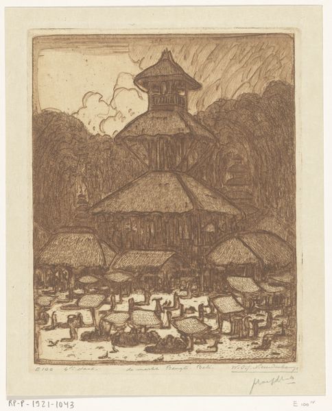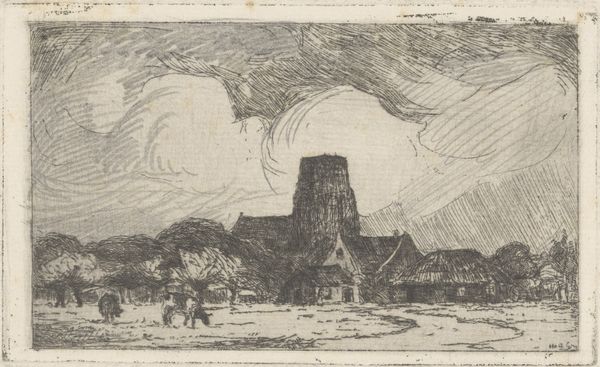 Editor: This is "Gezicht op Veere" or "View of Veere", an etching by Wijnand Otto Jan Nieuwenkamp, from 1901. The cityscape almost feels dreamlike with the towering clouds and slightly skewed perspective. What jumps out at you? Curator: It's interesting you mention "dreamlike," as the Symbolist movement was definitely influential at this time. What I find striking is how Nieuwenkamp frames Veere. It's not just a picturesque scene; it's deliberately constructed to evoke certain feelings about the place. Think about the function of art in the public sphere and the social role that art can play. It is a deliberate message to influence our appreciation for Veere. Editor: Could you elaborate? What feelings or ideas might he be trying to convey? Curator: Consider the year: 1901. The etching leans towards Art Nouveau in style. Notice the idealized view of the medieval town and monumental architecture dwarfing people. The towering clouds above could represent power, be it nature, deity or the divine right of rule. The clouds are visually distinct, almost alive, aren’t they? I wonder if the artist intends them to express some type of looming over-power. Editor: Yes, I see that now. It's as if Nieuwenkamp isn't just showing us Veere, but trying to create a narrative about its historical importance, but there also this weight of ominous nature. It makes me question, how were Dutch cities selling themselves? What message were they trying to project during this period? Curator: Precisely! And how might this idealized image of a historical town contrast with the realities of urban life at the time? These questions bring us to the politics of imagery. Was Nieuwenkamp selling the memory of power or foreshadowing inevitable power of a rising element? Editor: This has completely changed how I see the print. Now, I don't just see a landscape, but a constructed narrative and social artifact. Curator: Exactly! It's about recognizing that art never exists in a vacuum. Instead, art exists as an intricate part of culture, society and people!