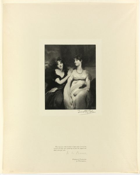 Editor: This is Timothy Cole's "Portrait of Mrs. Siddons," likely made between 1899 and 1902. It's an engraving, a print on paper. It’s mostly grayscale; it makes me feel like I'm peering into the past, the image is hauntingly beautiful, the subject's eyes very engaging, what is your opinion? Curator: Intriguing. Consider how the engraver’s line work defines form and texture. Observe the subtle gradations of tone; they mold the figure, creating an interplay of light and shadow that activates the surface. Does this precise rendering enhance or detract from the sitter's presence? Editor: I think the detail does bring her to life. I wasn't expecting the level of depth. The textures seem crucial; I am not sure whether to describe them as delicate or bold, they must shape the composition of the entire work... Do you find symbolic significance in the figure’s clothing, or its somber setting? Curator: Not particularly. Focus, instead, on the interplay of contrasting tonal values, dark versus light; analyze the relation between these tonal arrangements, their relation to one another, and, from there, deduce the formalist intentions driving Cole's visual strategy. Can you see what sort of effect such attention creates? Editor: It does push me to look closer, analyzing each choice regarding shades, shapes, etc. I see how powerful such deliberate arrangements may affect our emotional response! Curator: Precisely. Recognizing how visual elements affect the spectator represents, quite possibly, our grandest achievement. Thank you for being open minded and thoughtful, while admiring this work, your own insight should remain the primary goal.